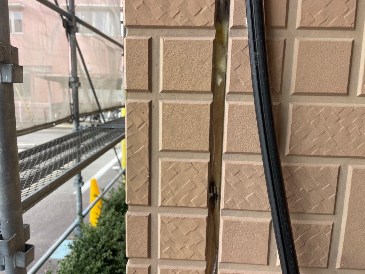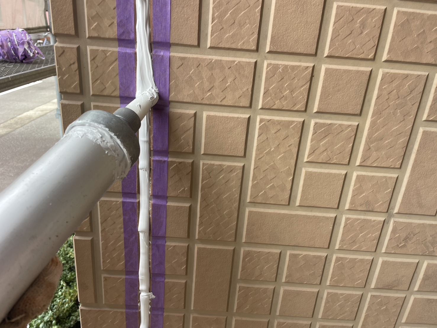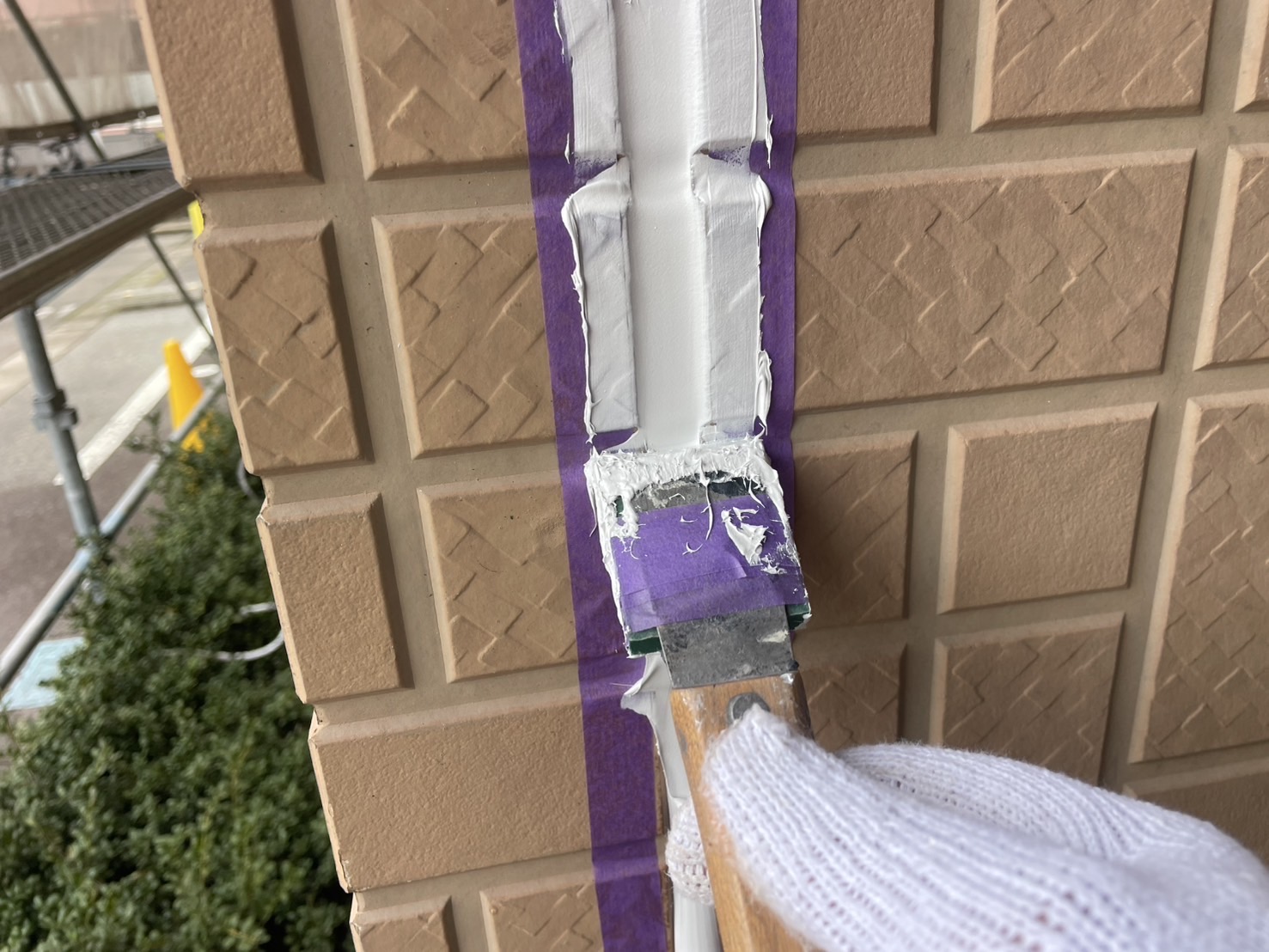 シーリング材を充填してへらで均していきます。外壁塗装専門店安井創建ではオートンイクシードという高い耐久性・耐候性をもつシーリング材を使用しています!