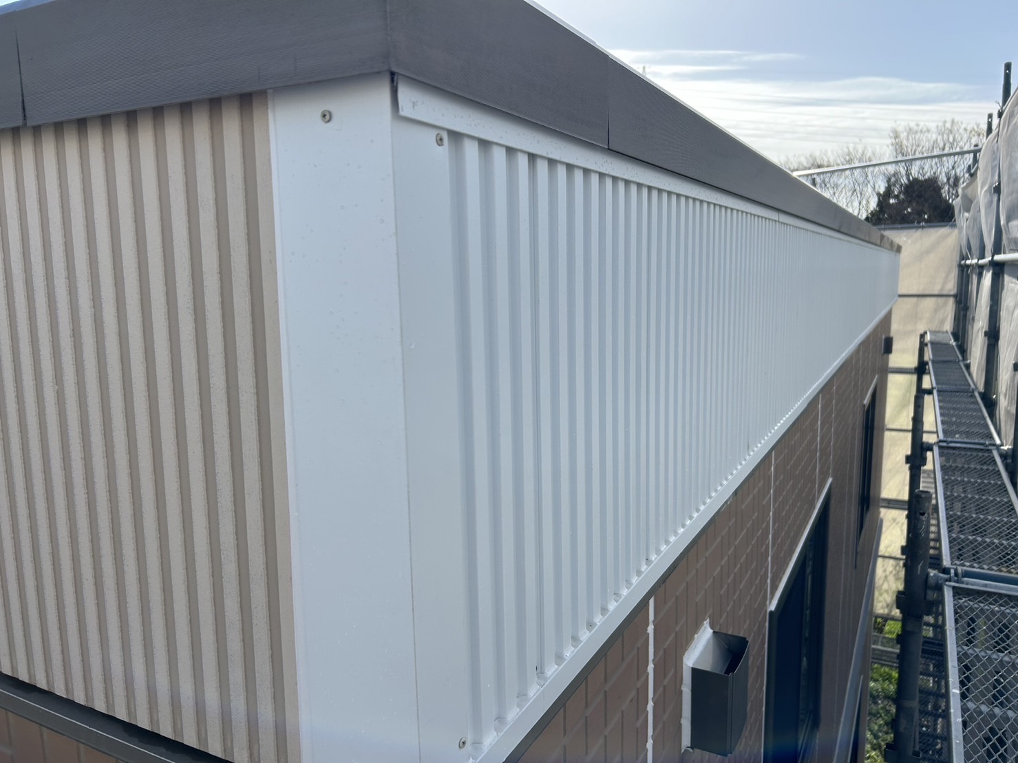 現状を踏まえて、凍害箇所は板金工事にて補修を行い、外壁全体は長期間美観を保つことのできる無機塗料のグランセラトップ2液水性を使用して塗装をすることとなりました。また、同時に屋上防水工事も行うこととなりました。