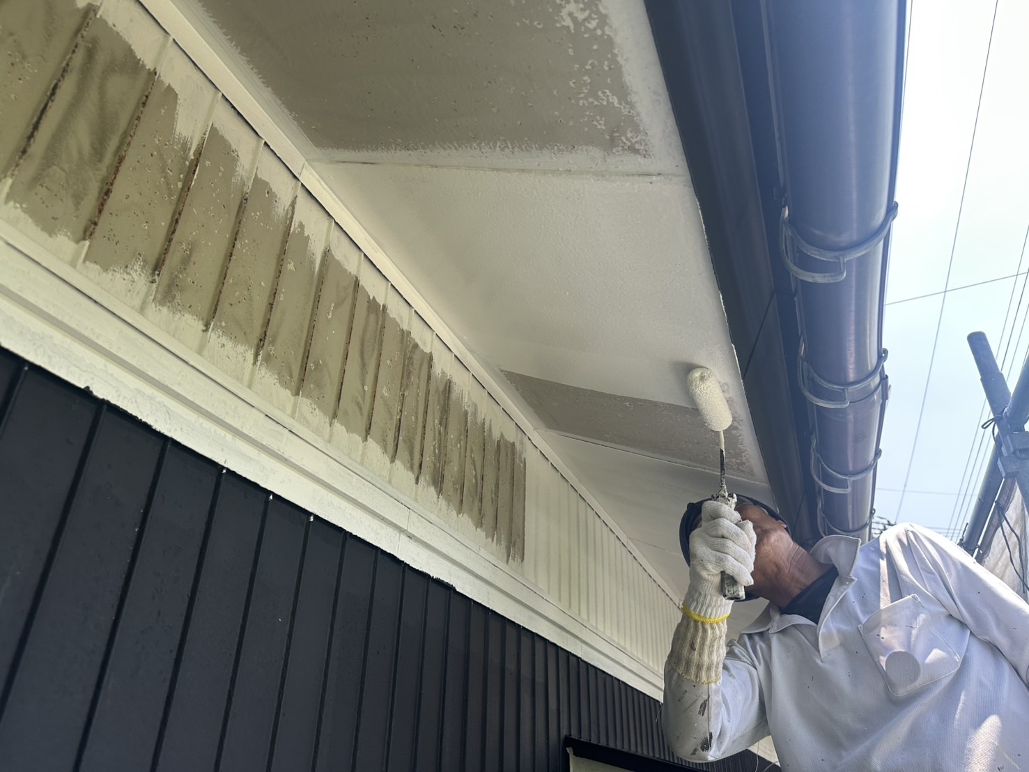 軒裏などの付帯部分も同様に1液ファインフッソUVを2回塗りして仕上げていきます。