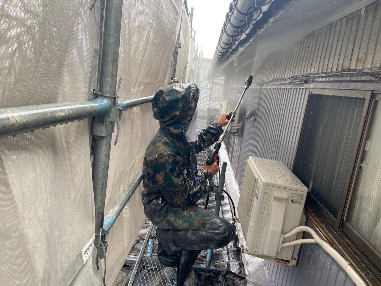 まずはじめに高圧洗浄をして長年の汚れをしっかりと落とします。