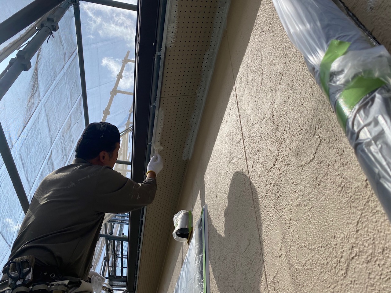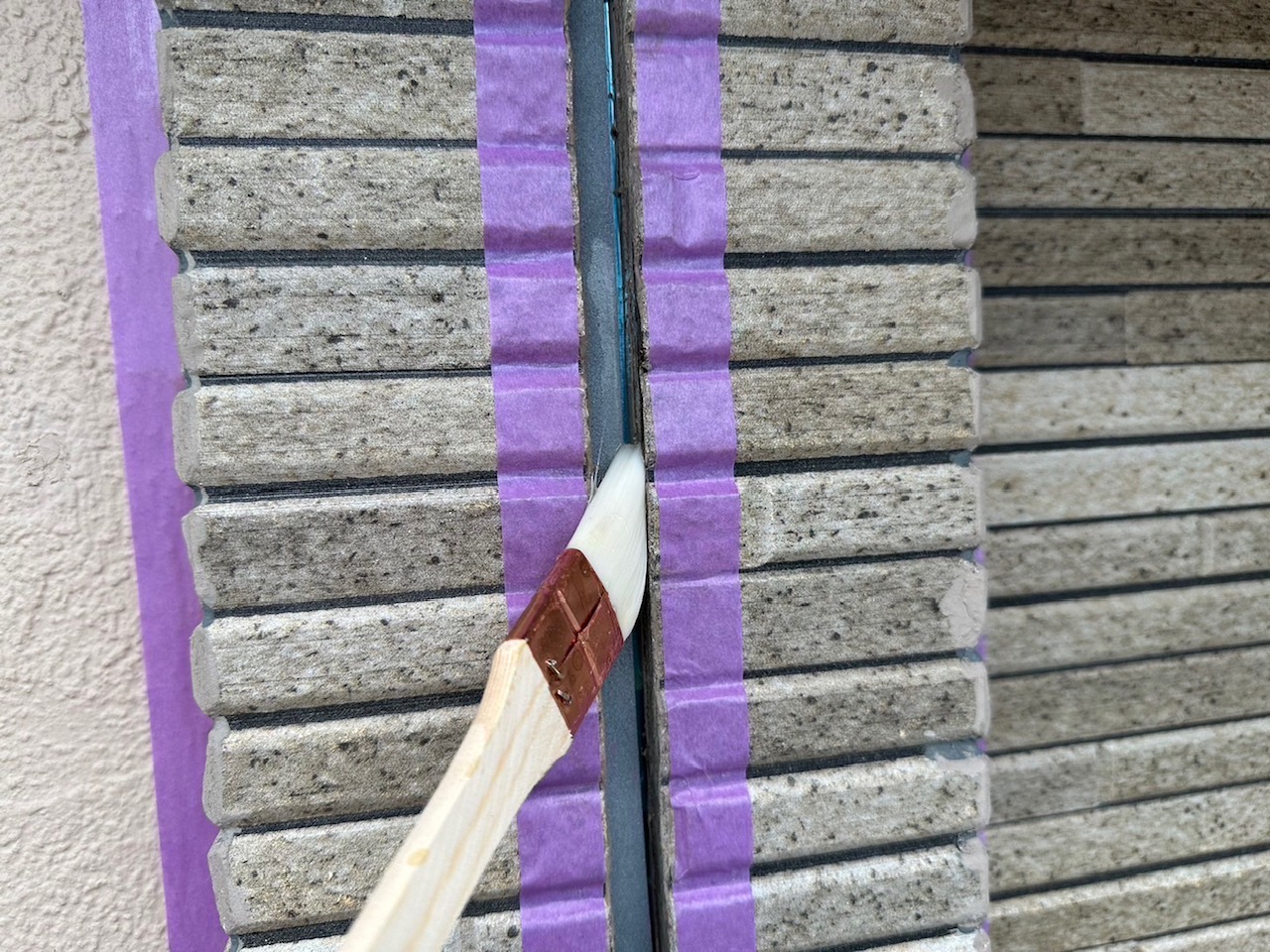 マスキングをしてプライマーを塗ります。プライマーはシールと建材を密着させ接着性を高める重要な役割を果たします。