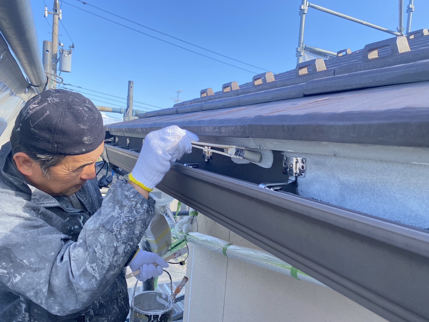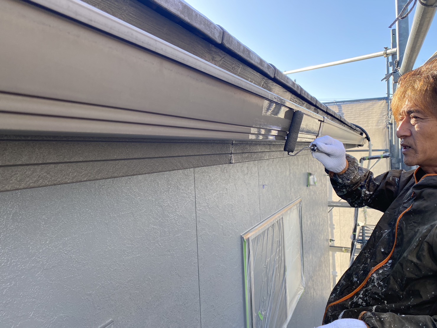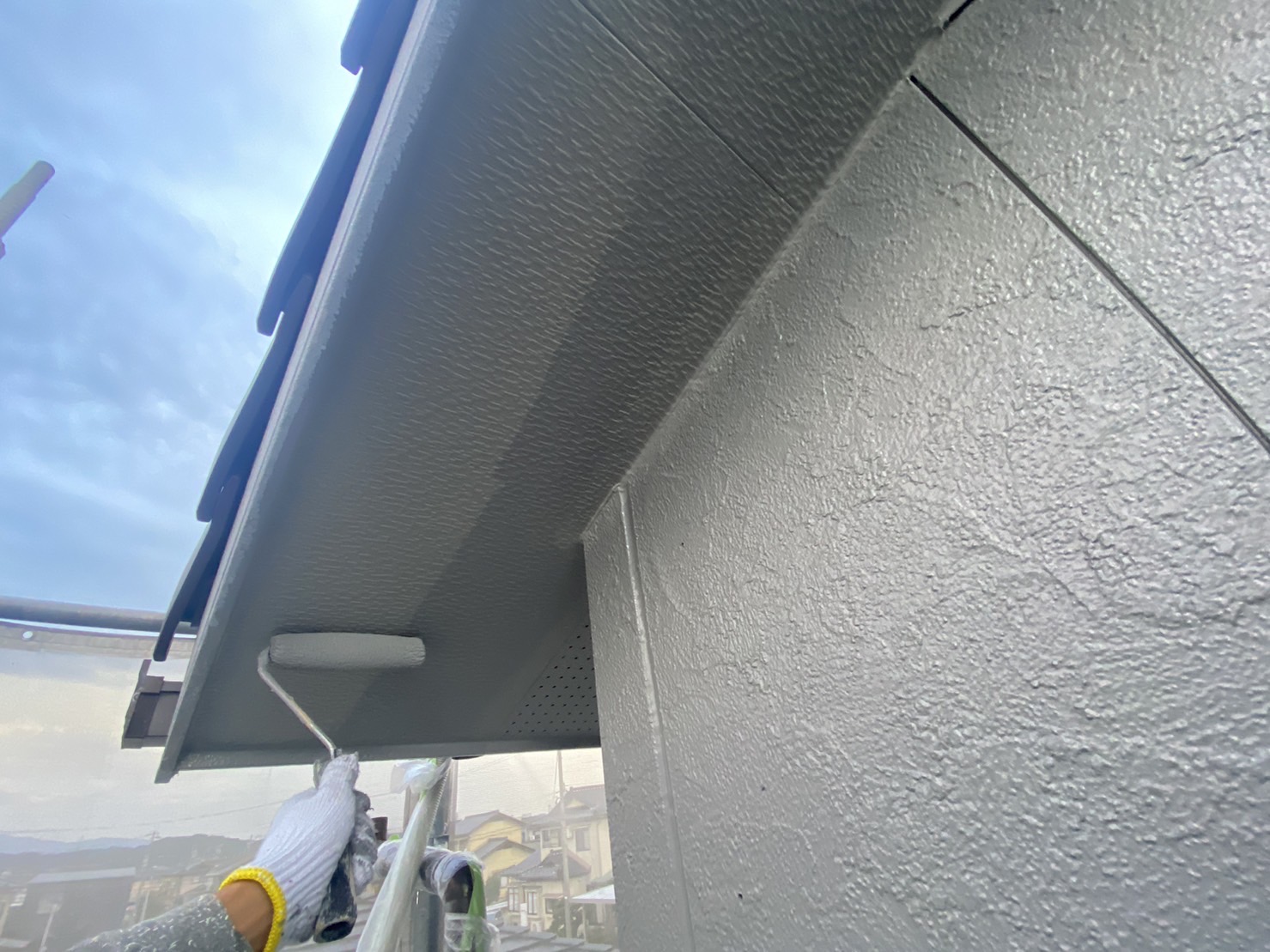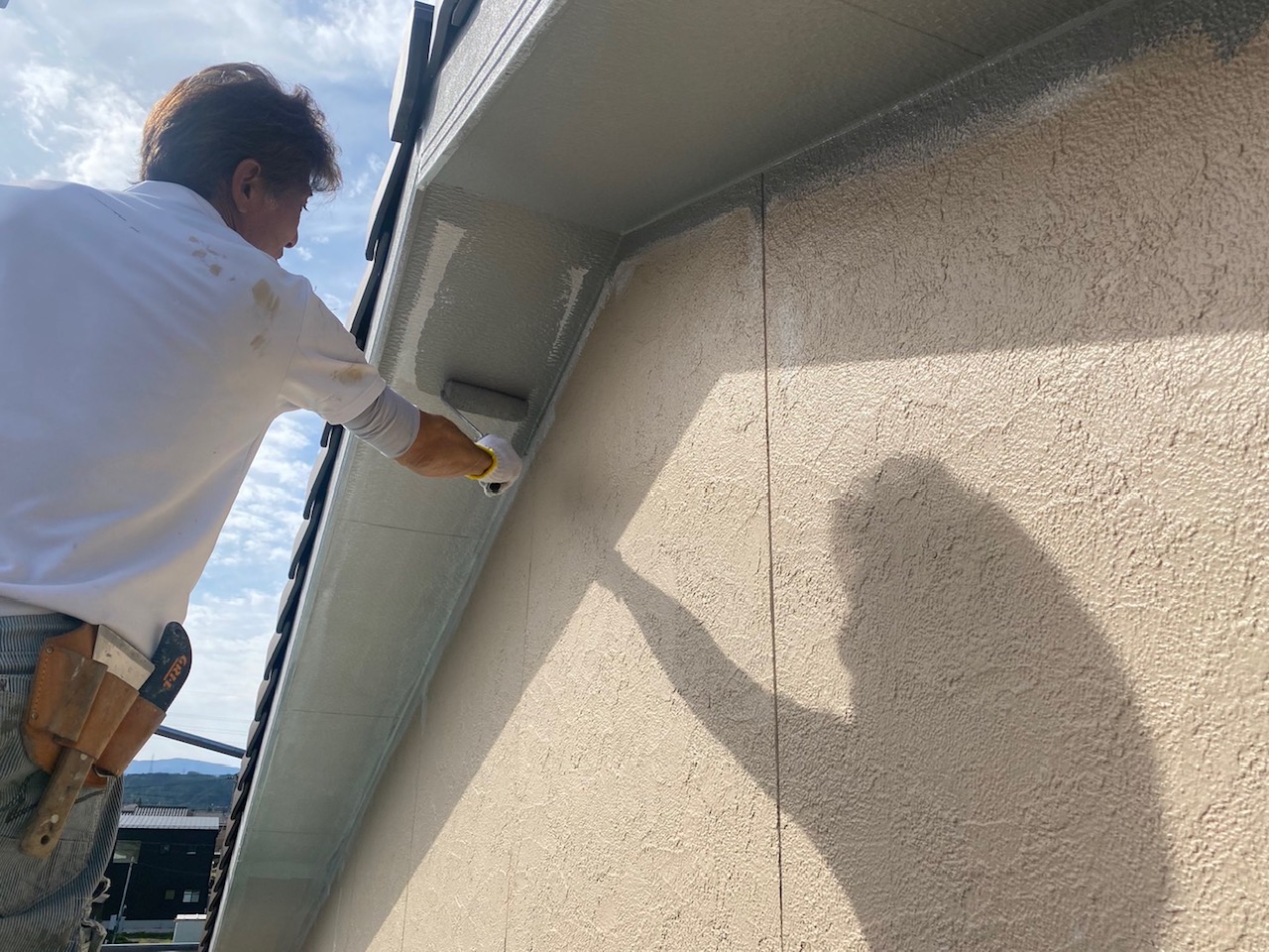 外壁や軒裏は、中塗り・上塗りをします。今回はパーフェクトトップでの2回塗りです。