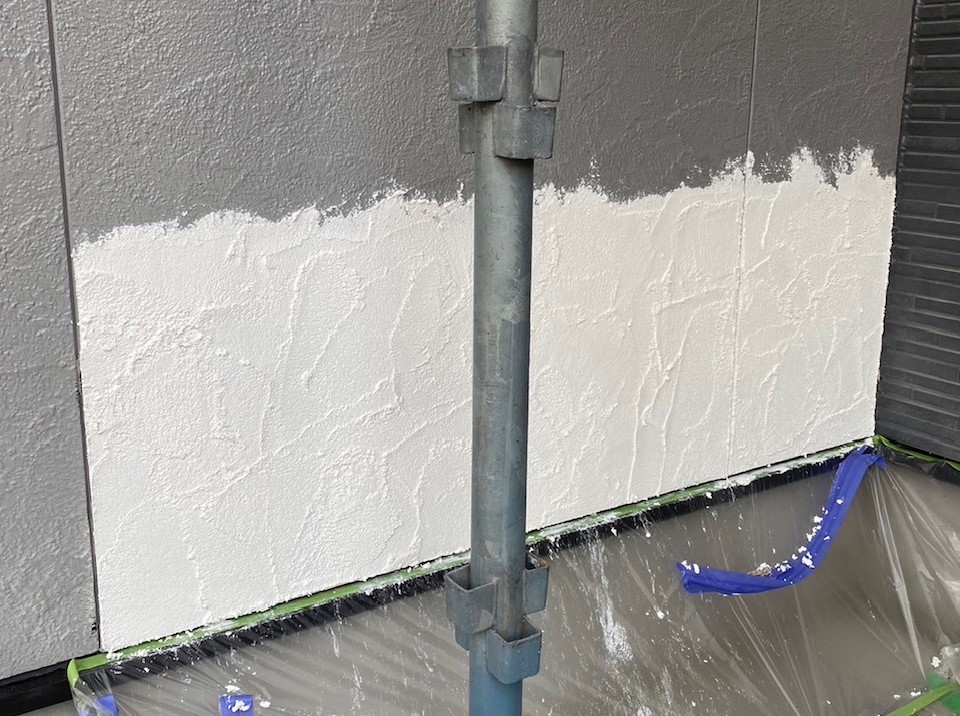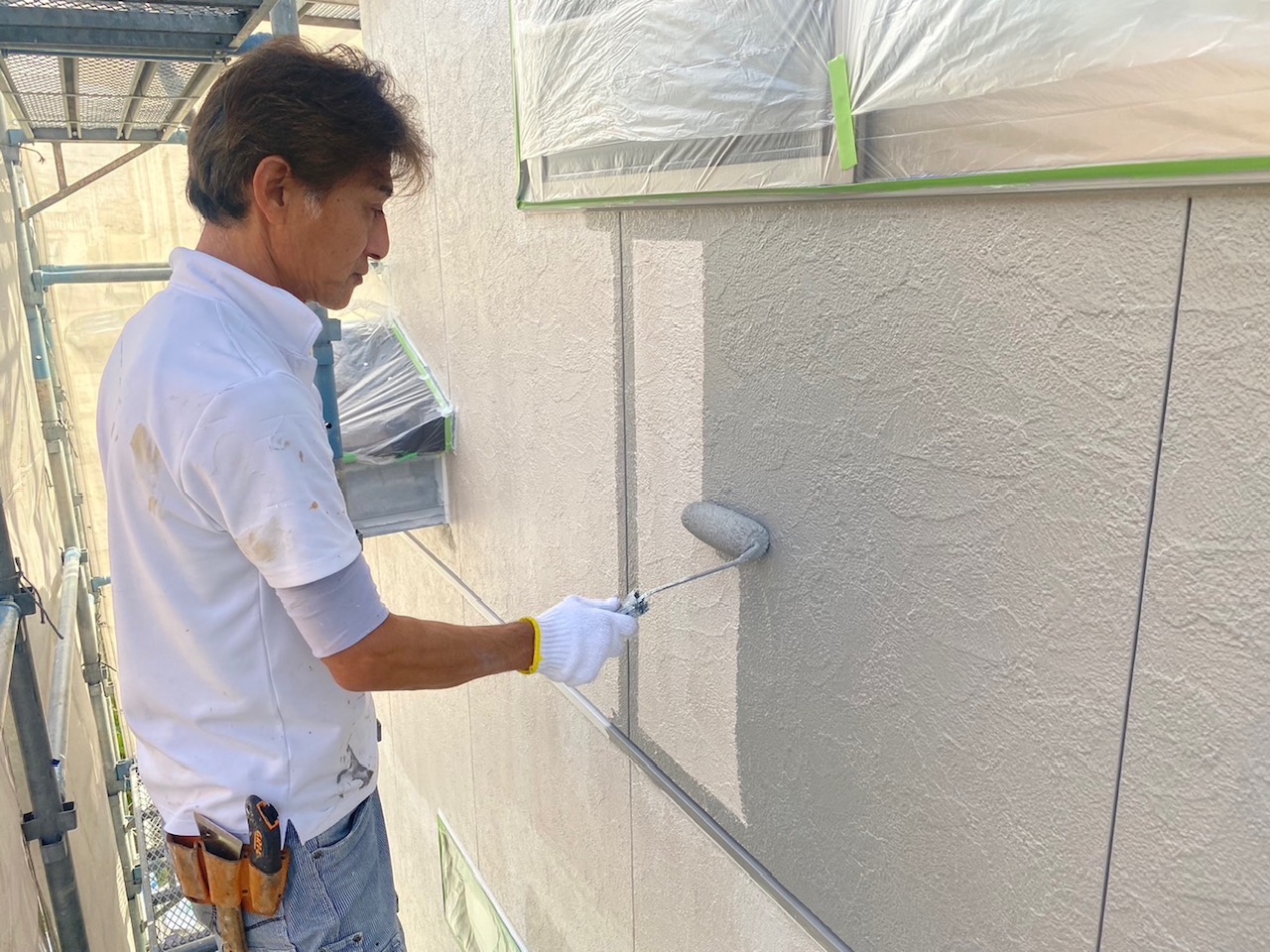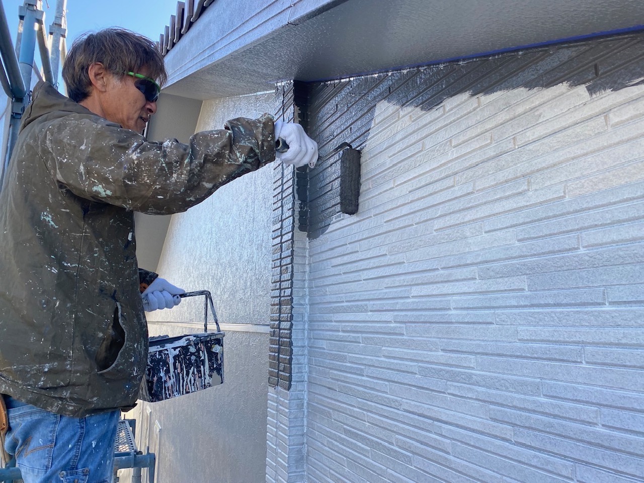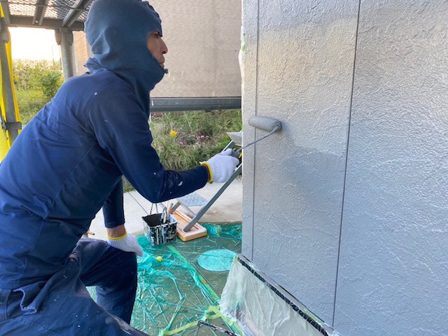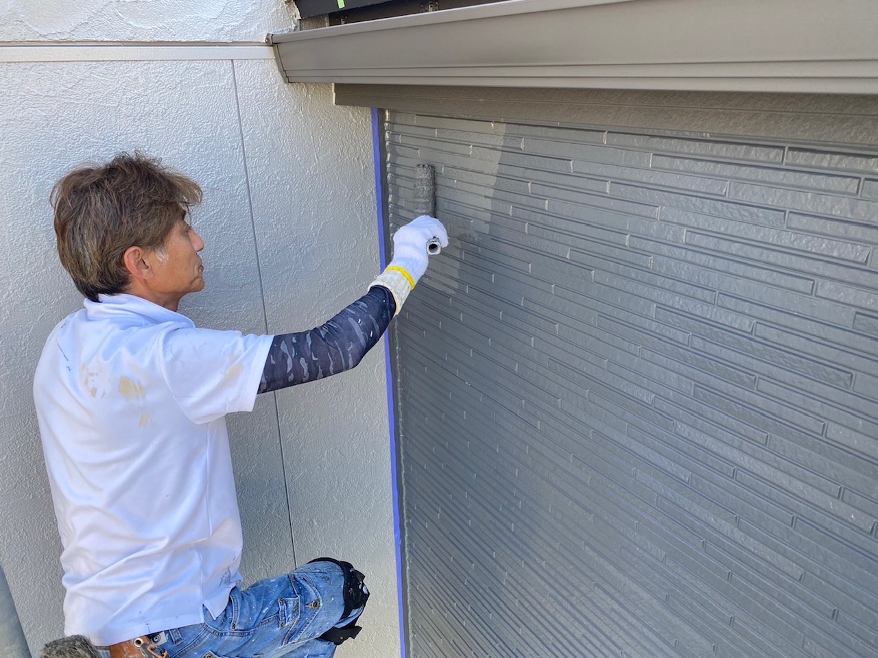 外壁や軒裏は、中塗り・上塗りをします。今回はパーフェクトトップでの2回塗りです。