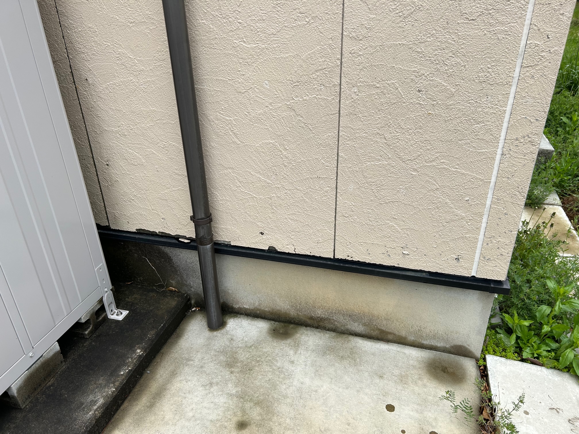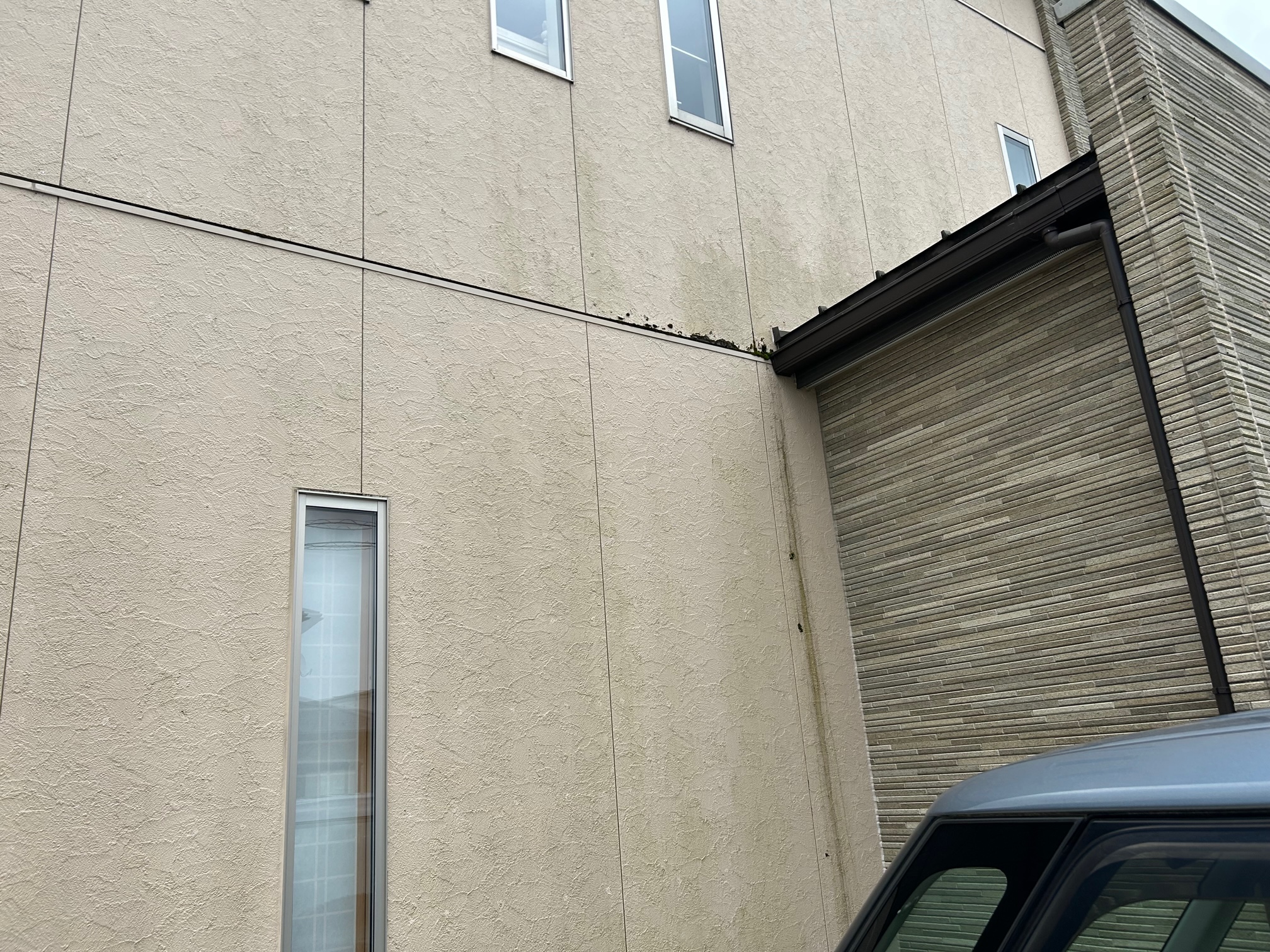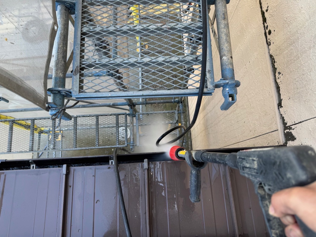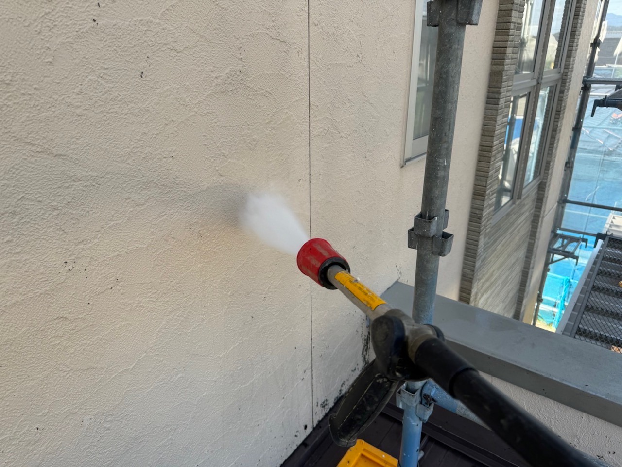 はじめに、外壁全体の高圧洗浄を行い、表面の汚れや藻をきれいに落とします。