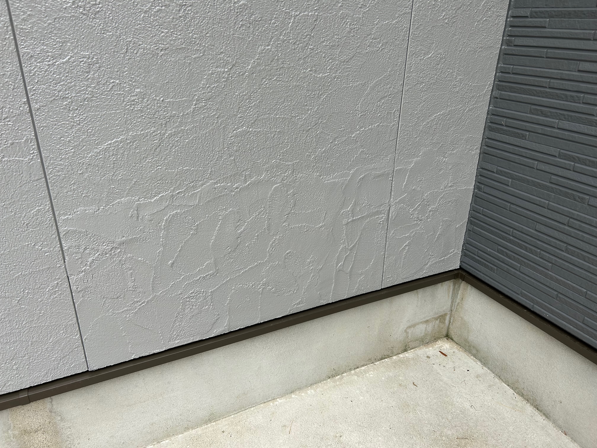 現調にお伺いしたところ、長年風にさらされたことにより全体に汚れや色褪せが目立ってきており、外壁の所々で剥がれがみられました。
