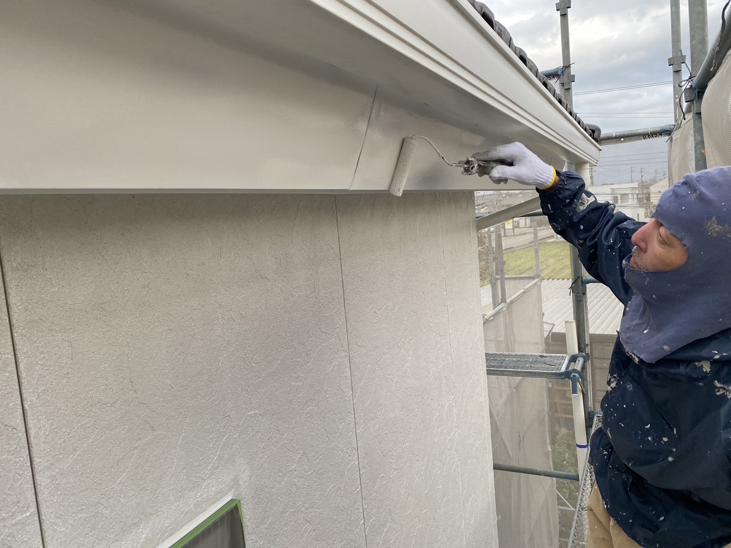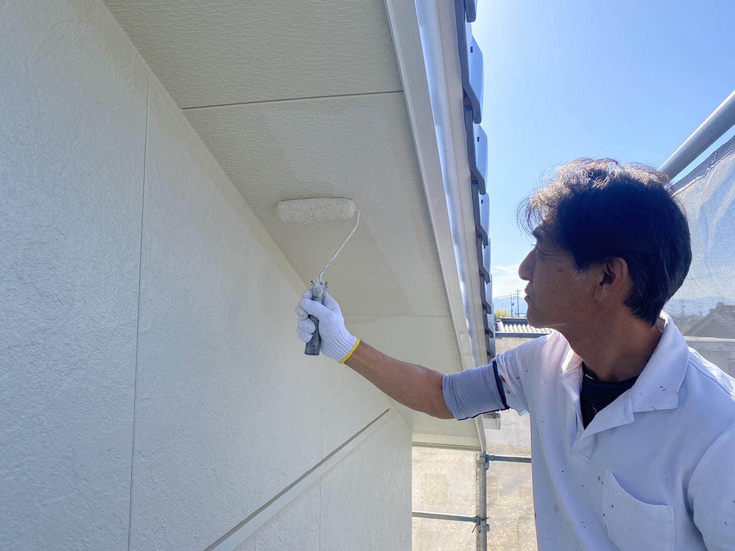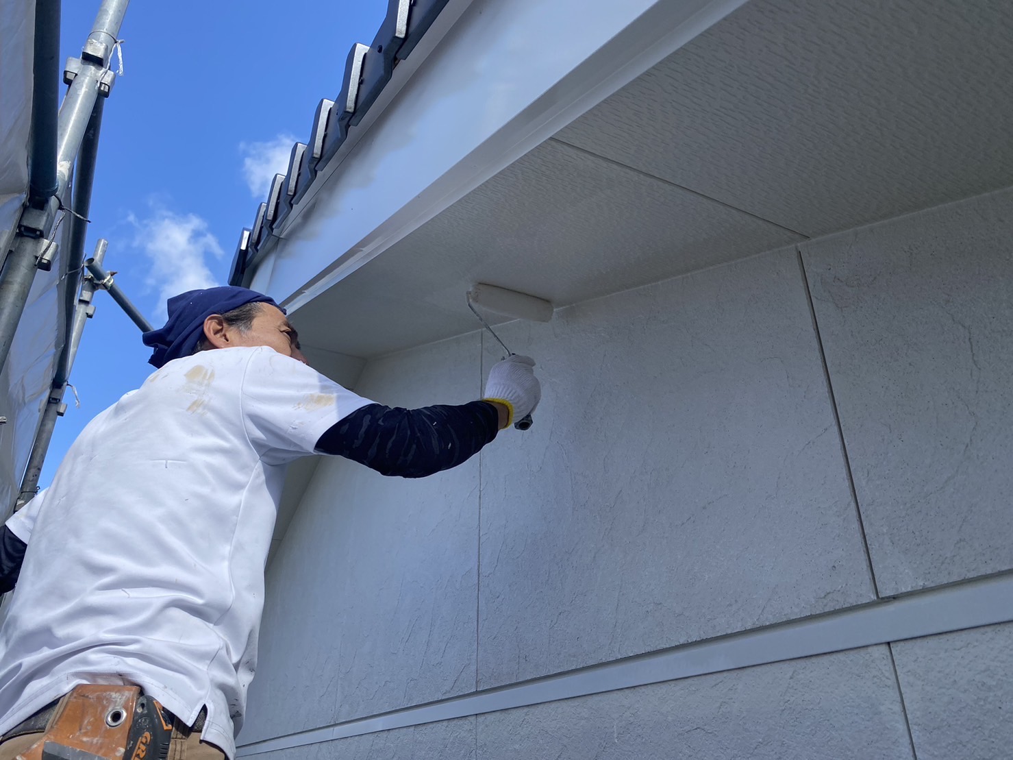 外壁や軒天の中塗り塗装をします。外壁はパーフェクトセラミックトップG、軒天は防カビ塗装です。