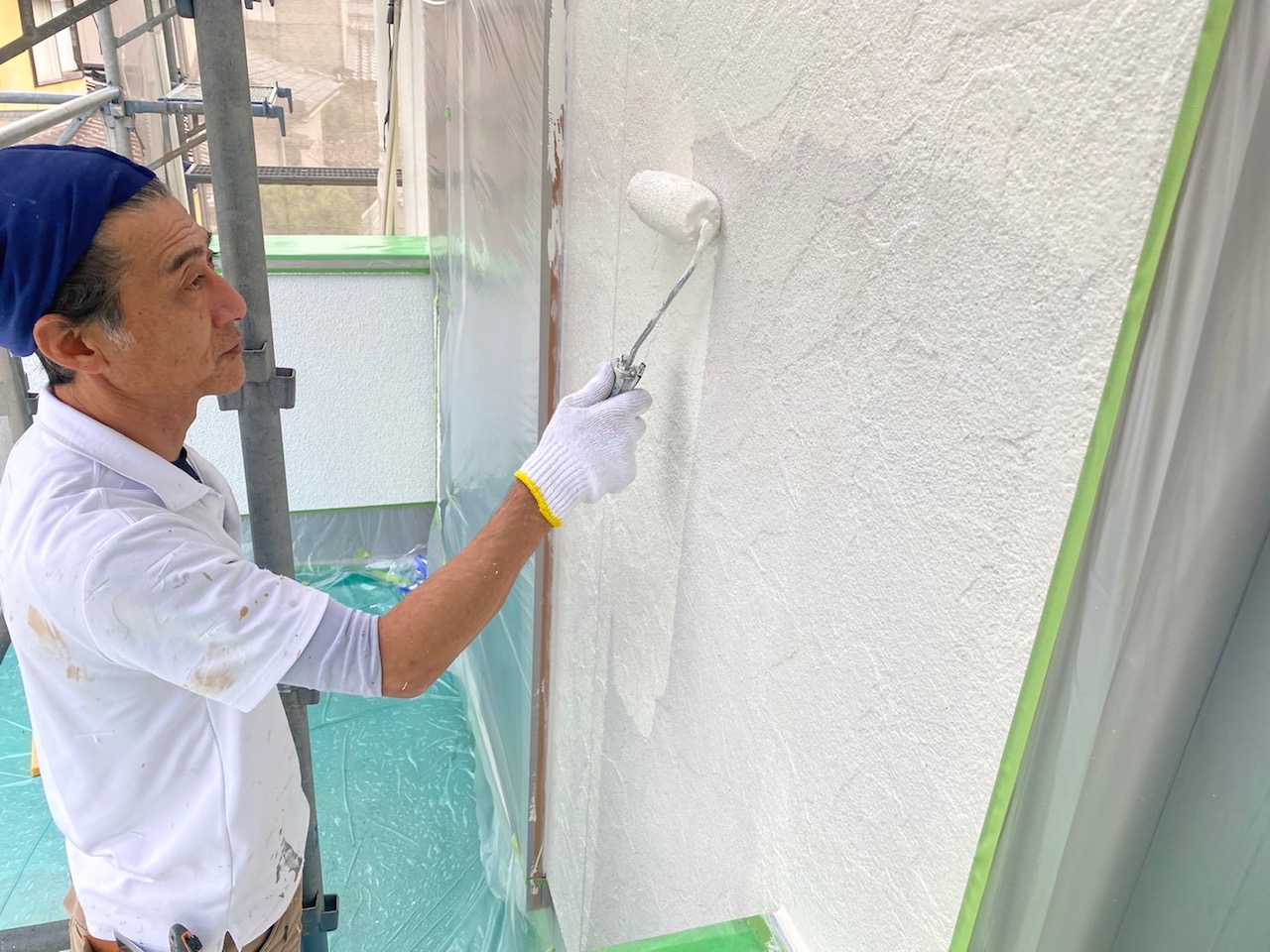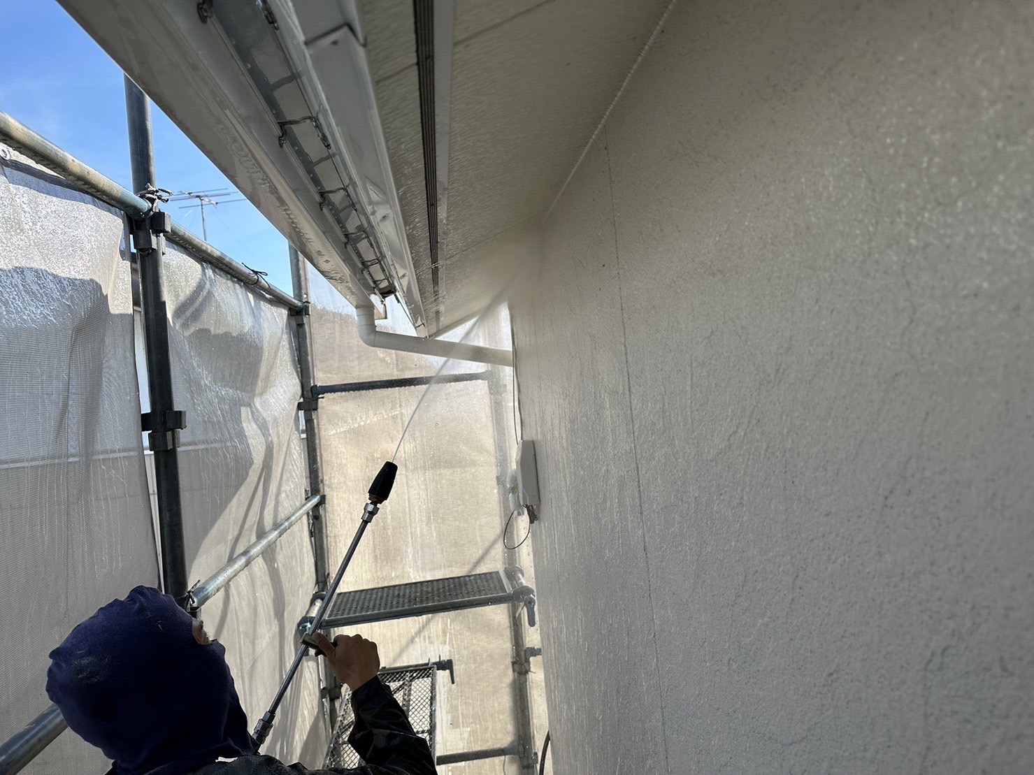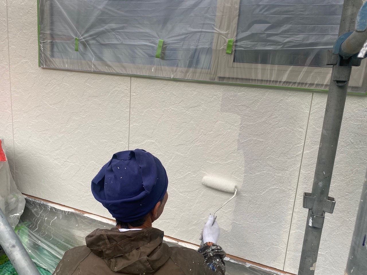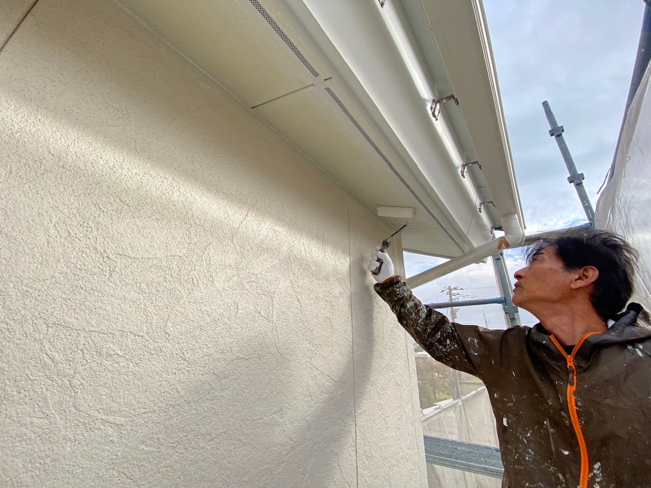 外壁や軒天の中塗り塗装をします。外壁はパーフェクトセラミックトップG、軒天は防カビ塗装です。