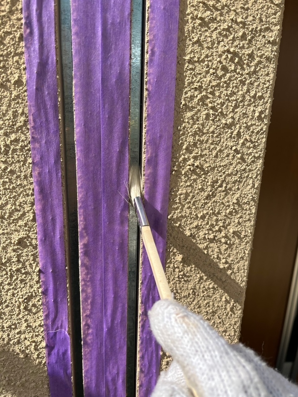 マスキングをしてプライマーを塗ります。プライマーはシールと建材を密着させ接着性を高める重要な役割を果たします。