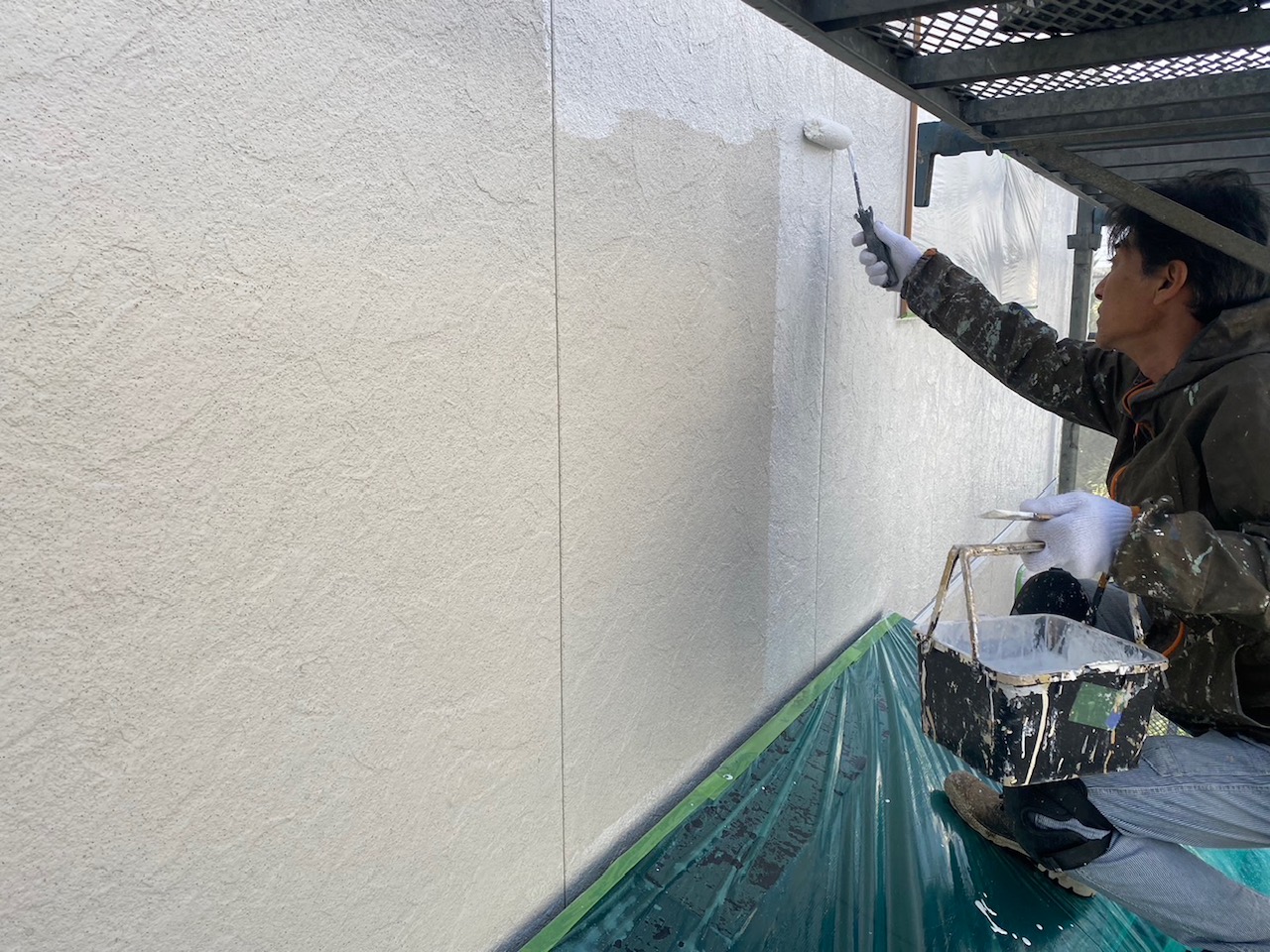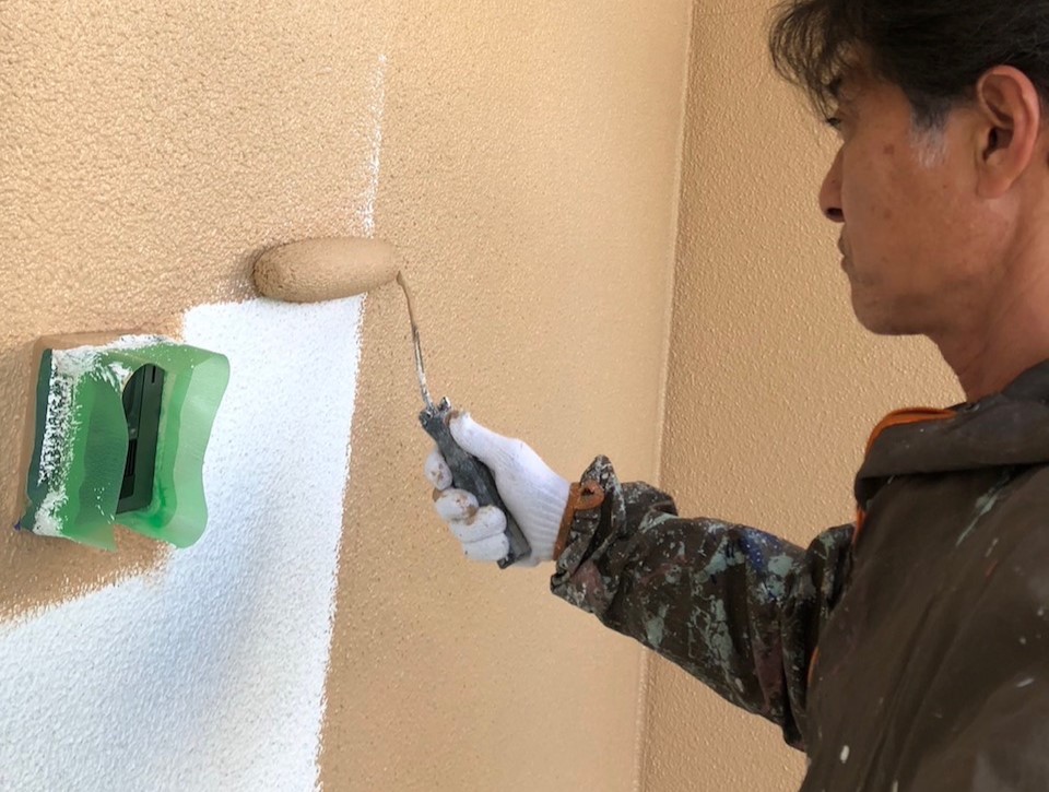 リシン吹付面の下塗りは、砂骨ローラーを使用して微弾性フィラーを厚塗りします。