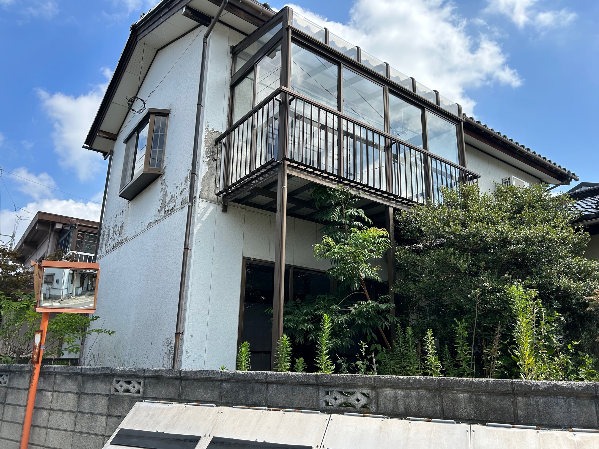 現調にお伺いしたところ、外壁の所々が剥がれ落ち、色褪せも進んでいる状態でした。