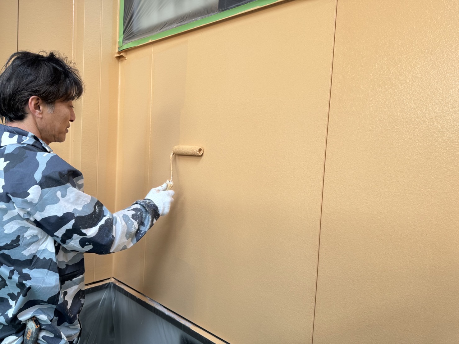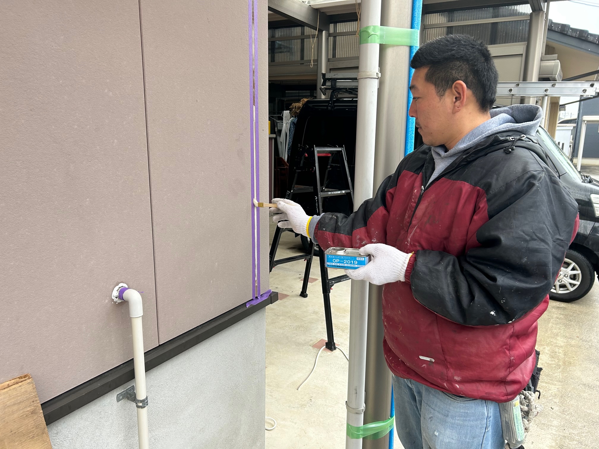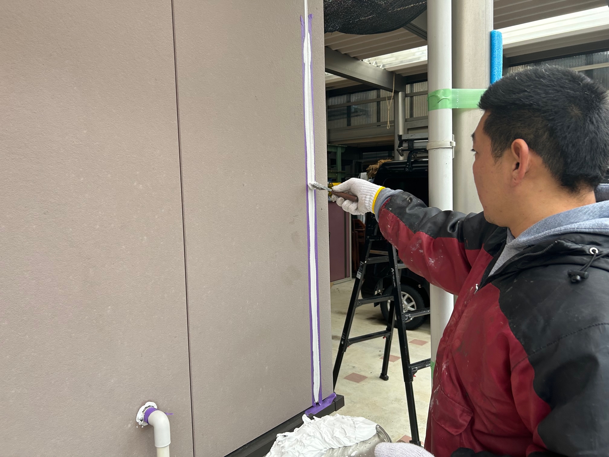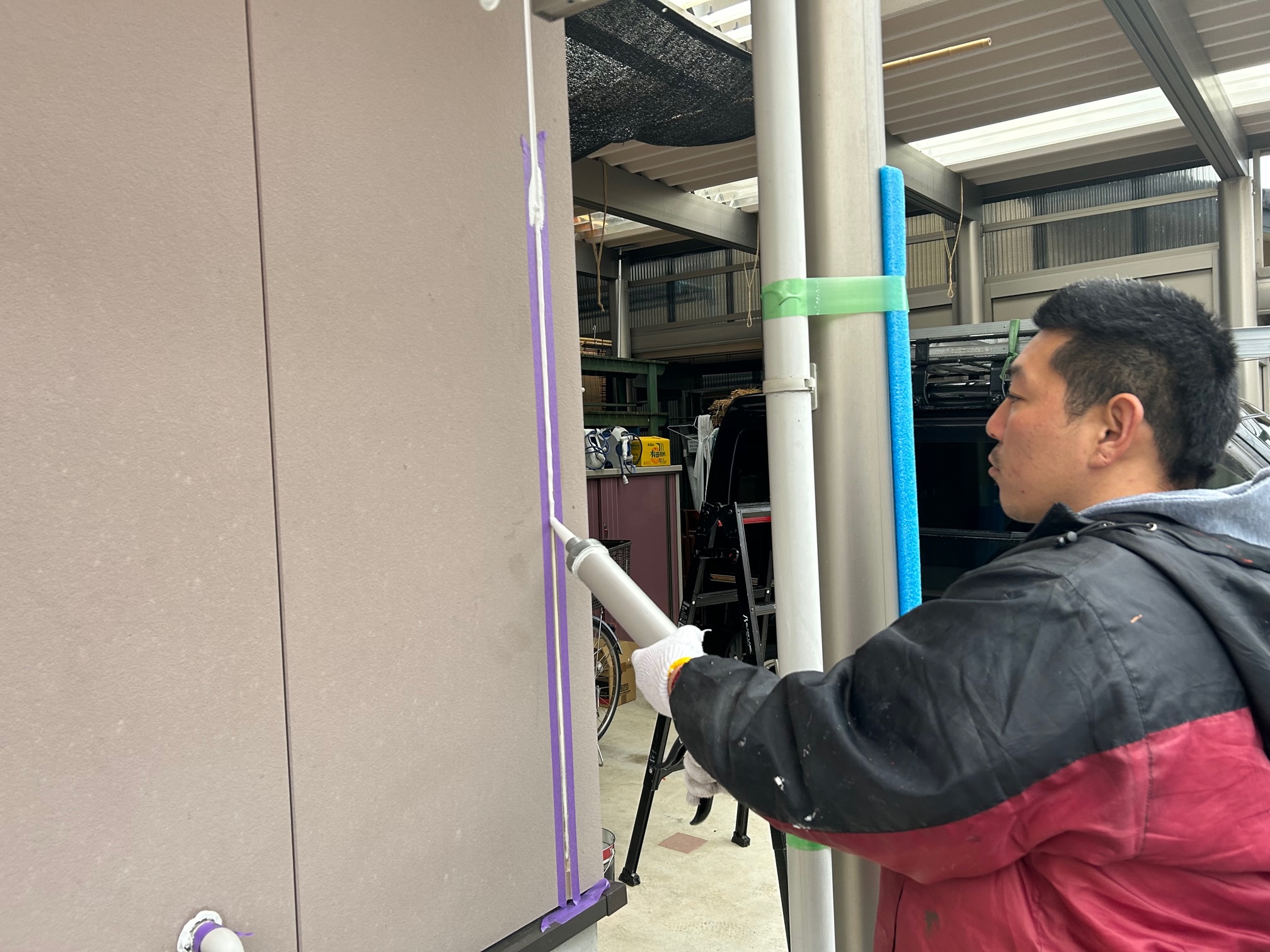 マスキングをして、プライマーを塗ります。プライマーはシールと建材を密着させ接着性を高める重要な役割を果たします。