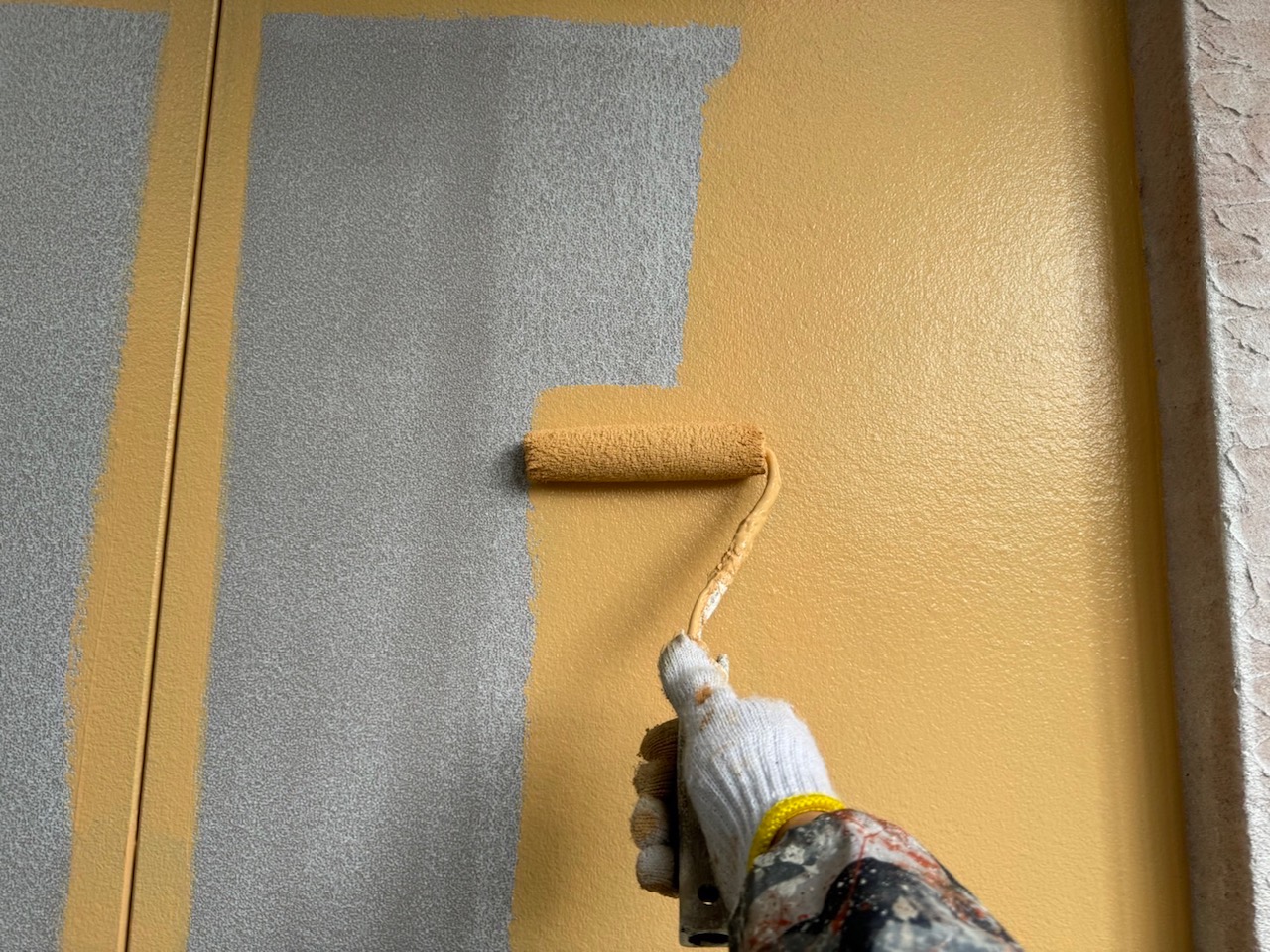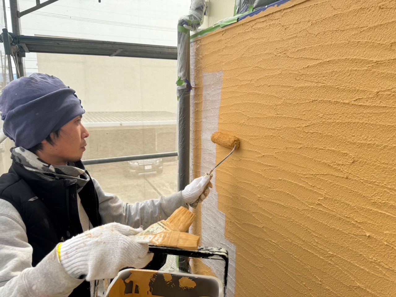 外壁のジョリパット部分は、プライマー塗装のあと、パーフェクトトゥルーマットを使用した中塗り・上塗りの3回塗りをしました。