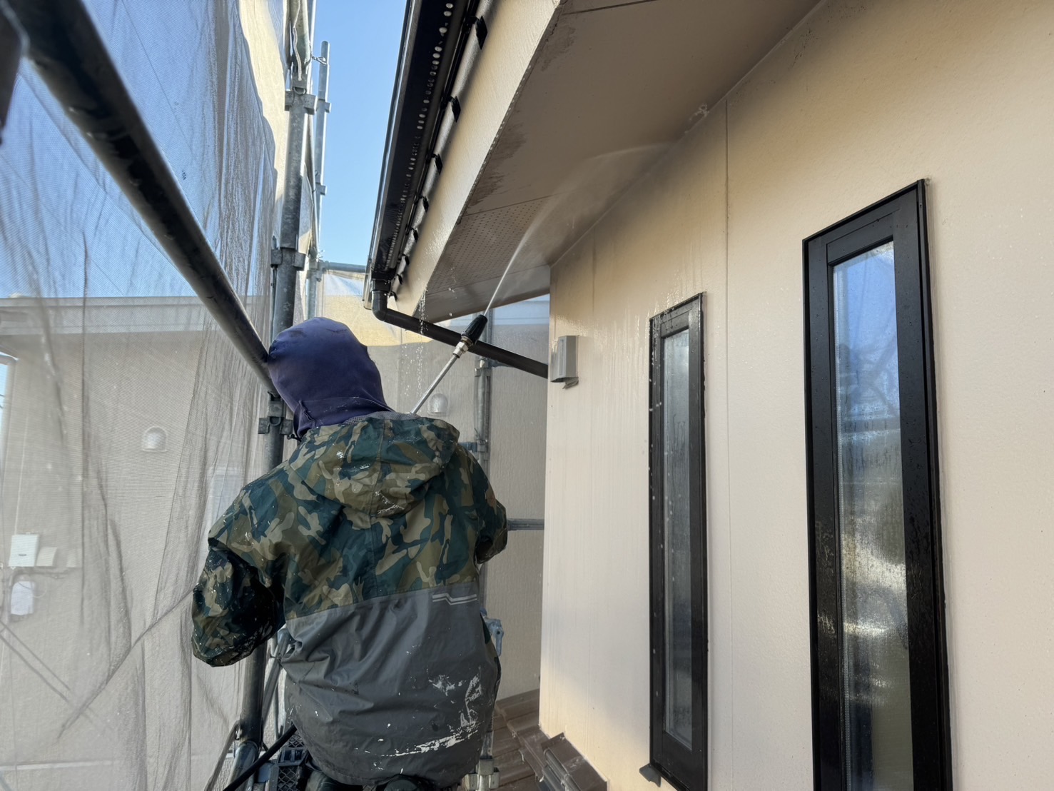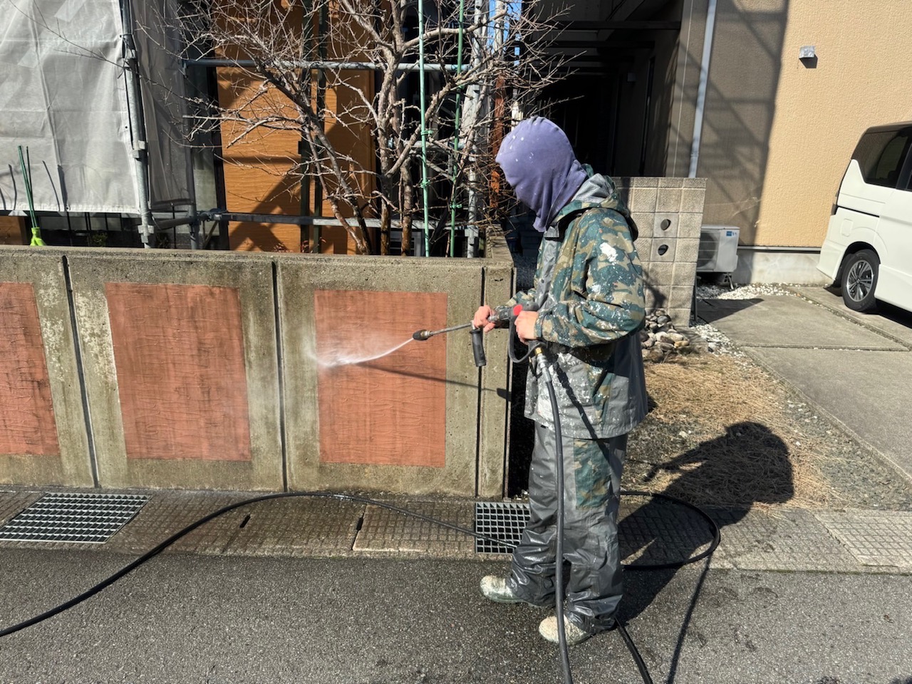 はじめに、軒裏や外壁の隅々まで高圧洗浄をします。外周にある塀も洗浄いたしました!