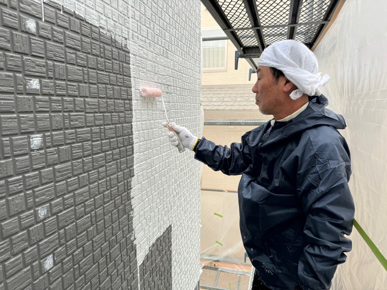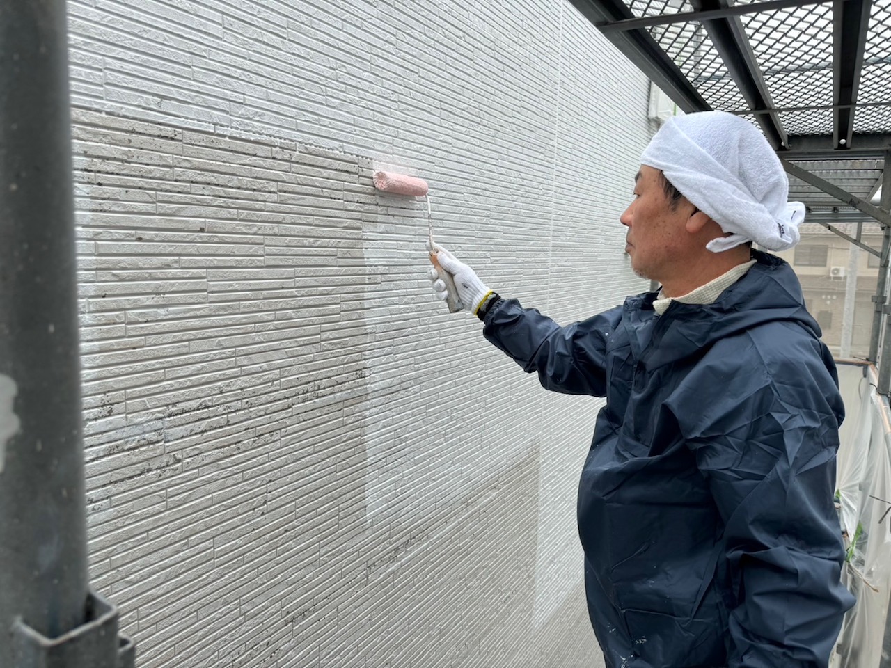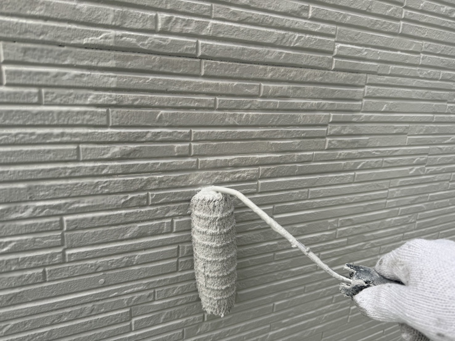 プライマー塗装をします。日本ペイント社製の「サーモアイプライマー」を使用しました。サーモアイプライマーを下塗りに使用することで、塗膜の日射反射率が向上します。