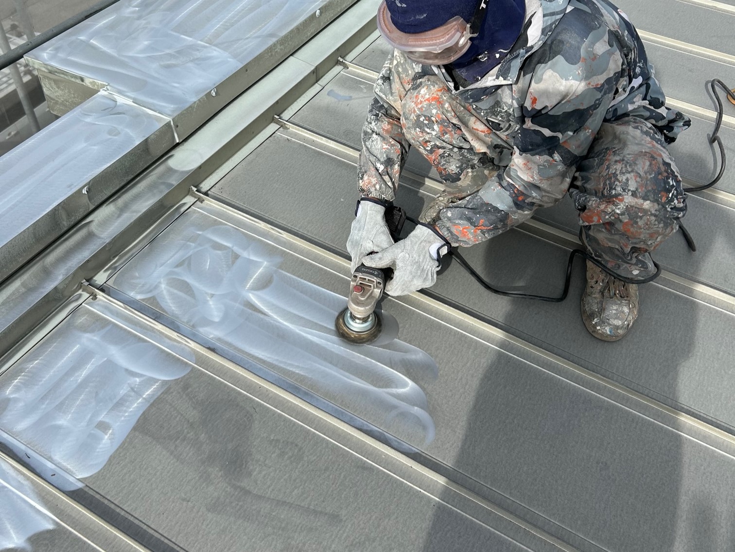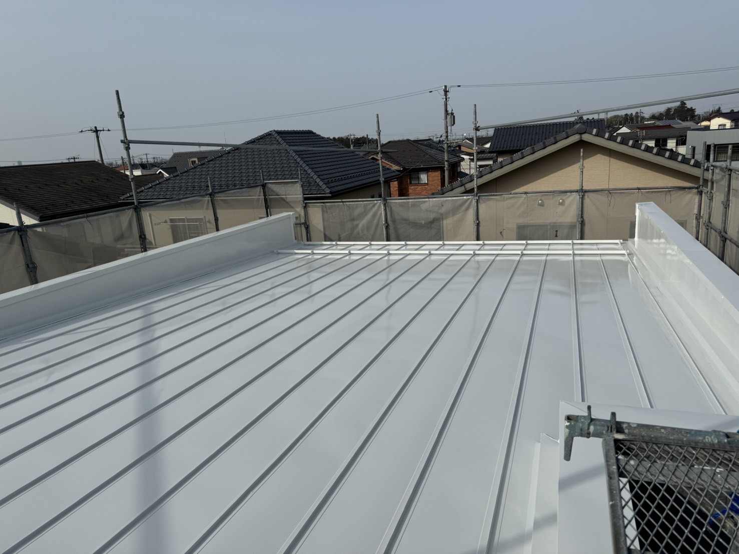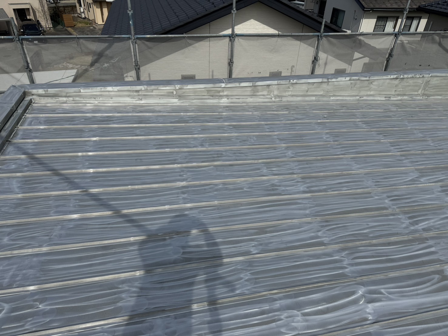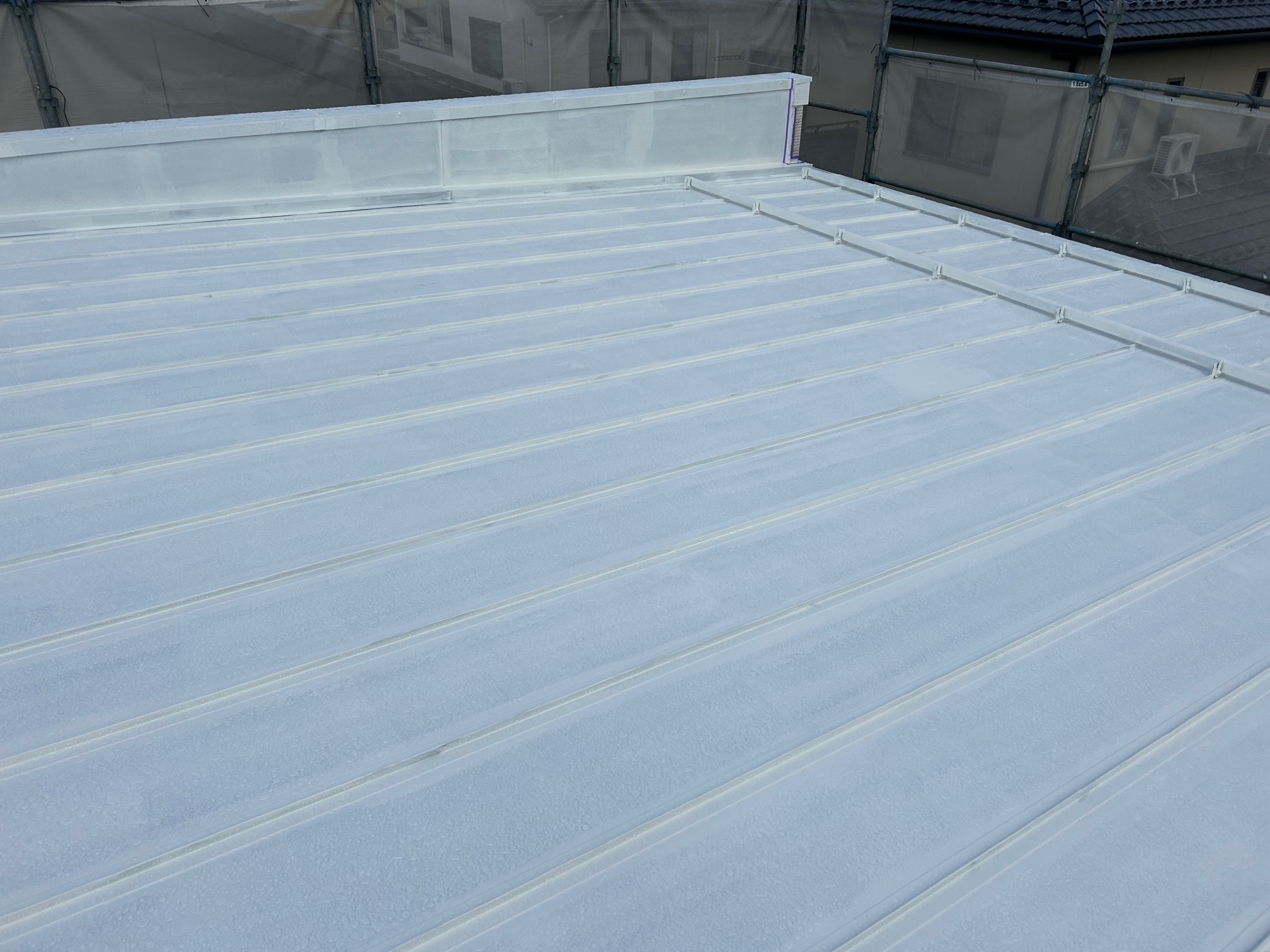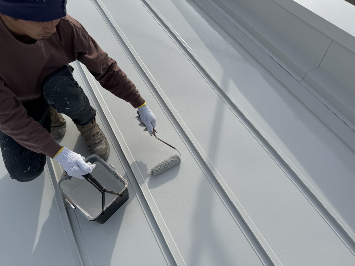 中塗り、上塗りをします。日本ペイント社製の「サーモアイSi」を使用しました。シリコン樹脂を使用しているため耐久性が高く、耐候性や光沢保持性に優れています。遮熱機能により屋根への蓄熱を抑制します。