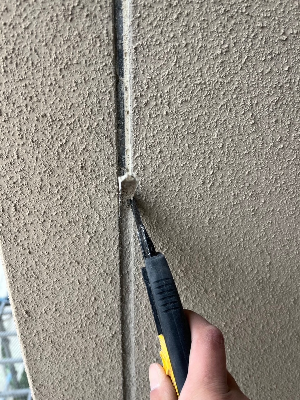 シール工事をします。まず、打ち替え部分の既存のシーリングをカットします。