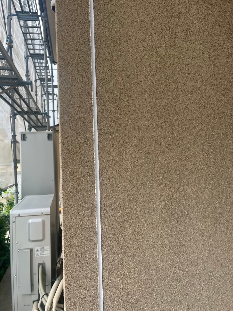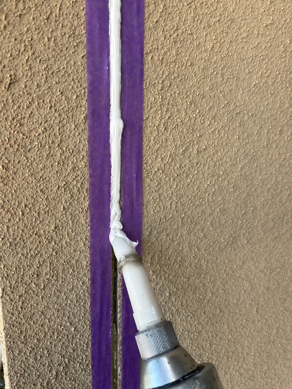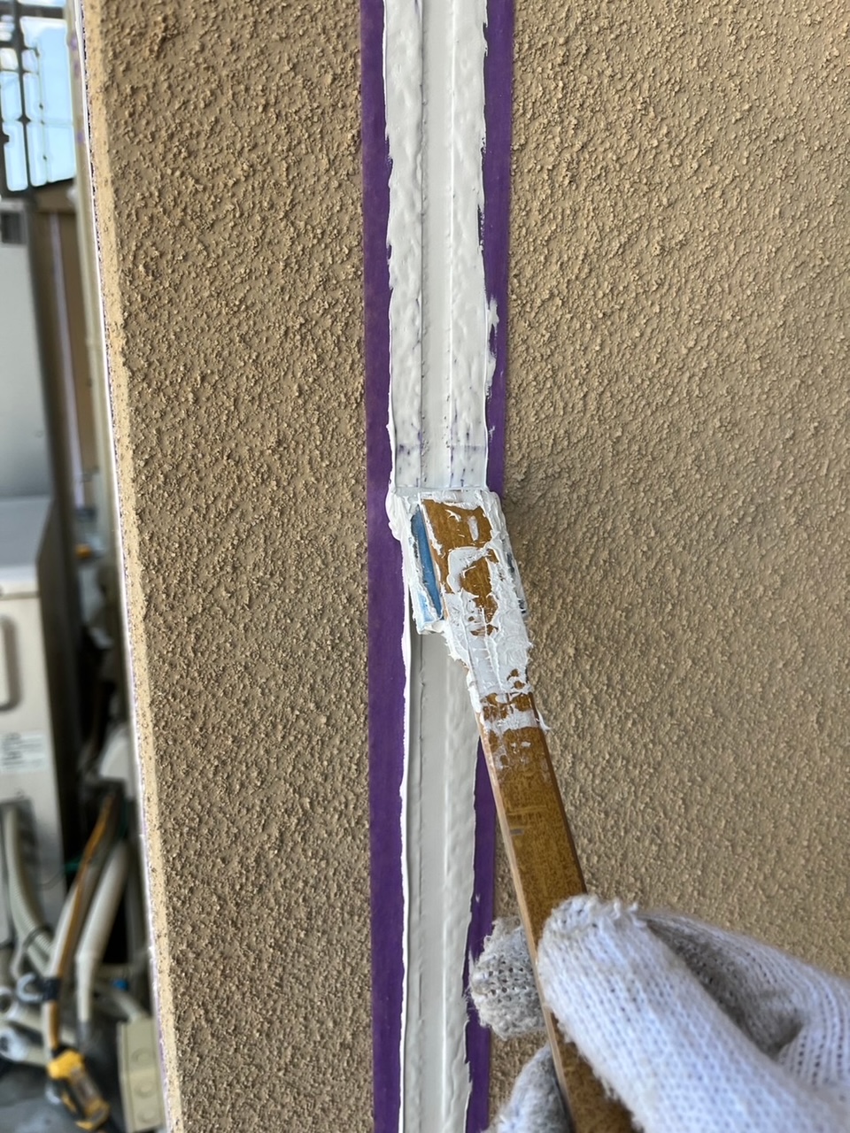シーリング材を充填してへらで均していきます。外壁塗装専門店安井創建では「オートンイクシード」という高い耐久性・耐候性をもつシーリング材を使用しています!