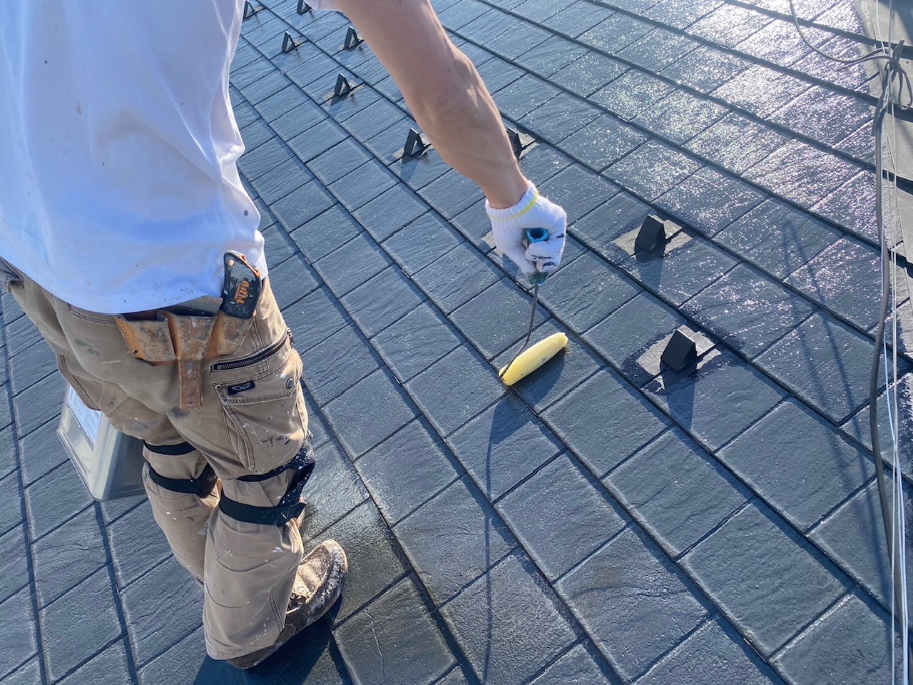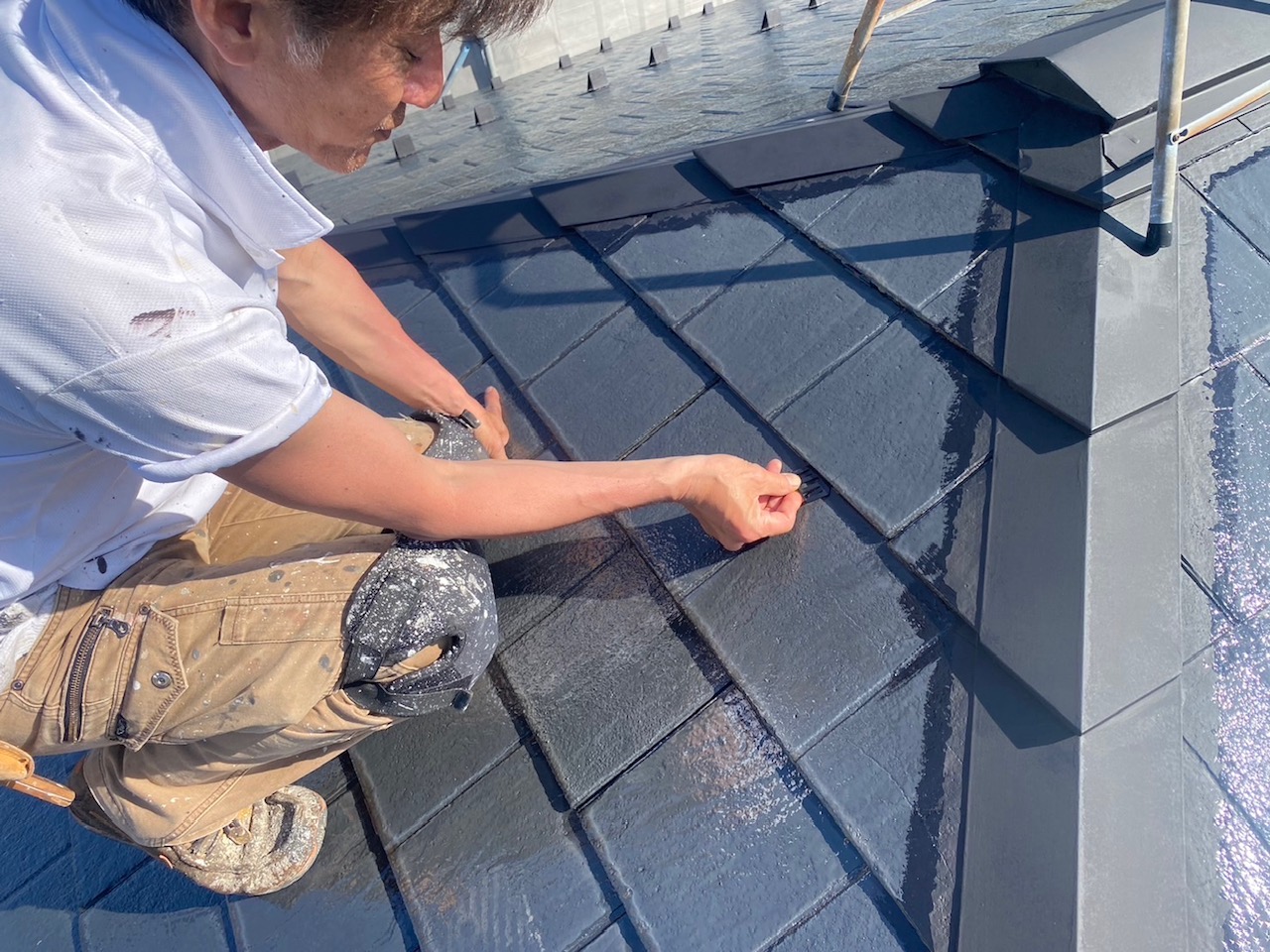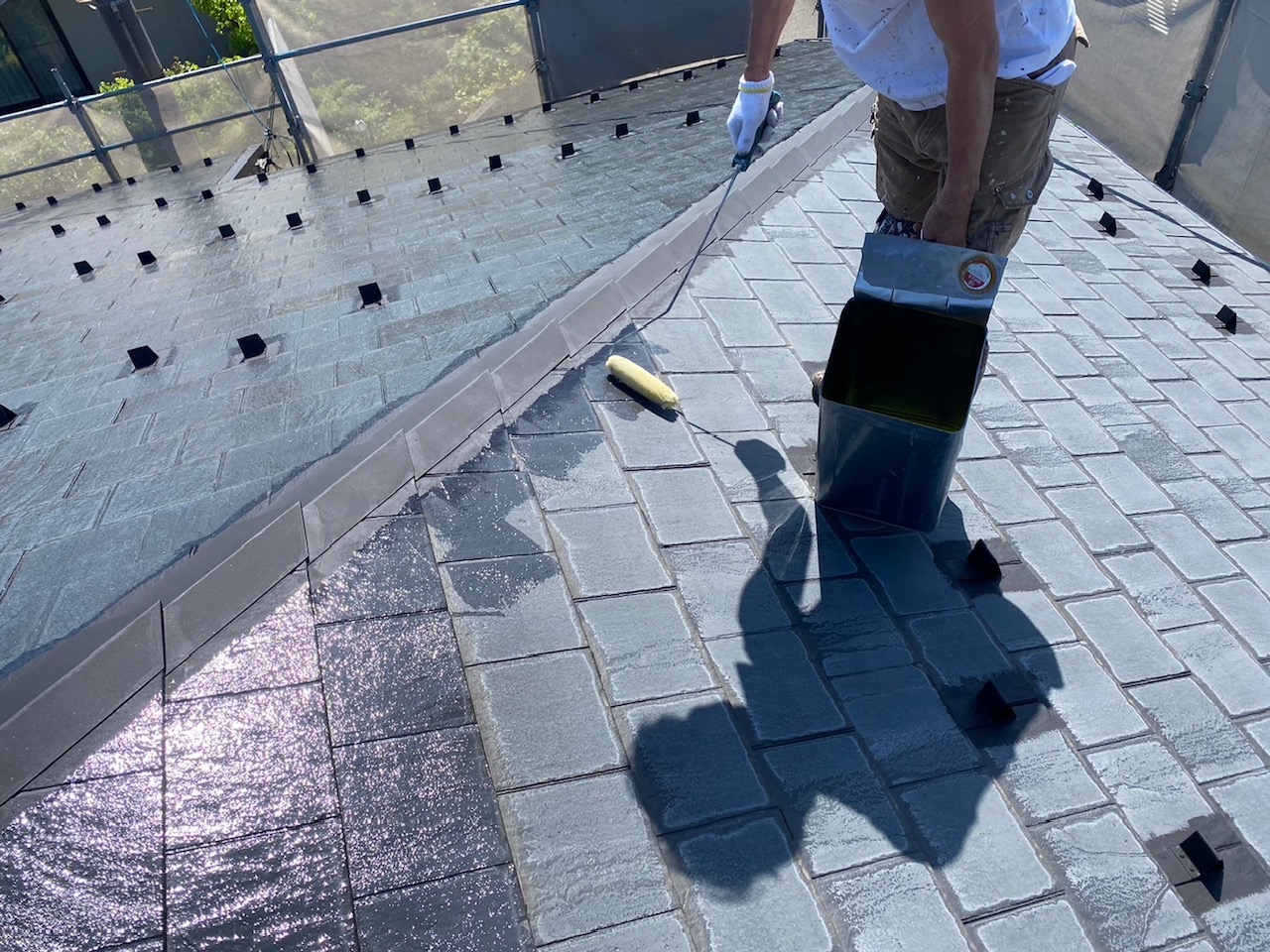 ファイン浸透造膜シーラーを使用して2回目の下塗りをします。下塗りを2回行うことで表面を均一にし、屋根材にプライマーをしっかりと浸透させます。これにより接着力が向上し、その後に塗る中塗り・上塗り塗料の密着力が上がり、塗装の持ちがよくなるのです!