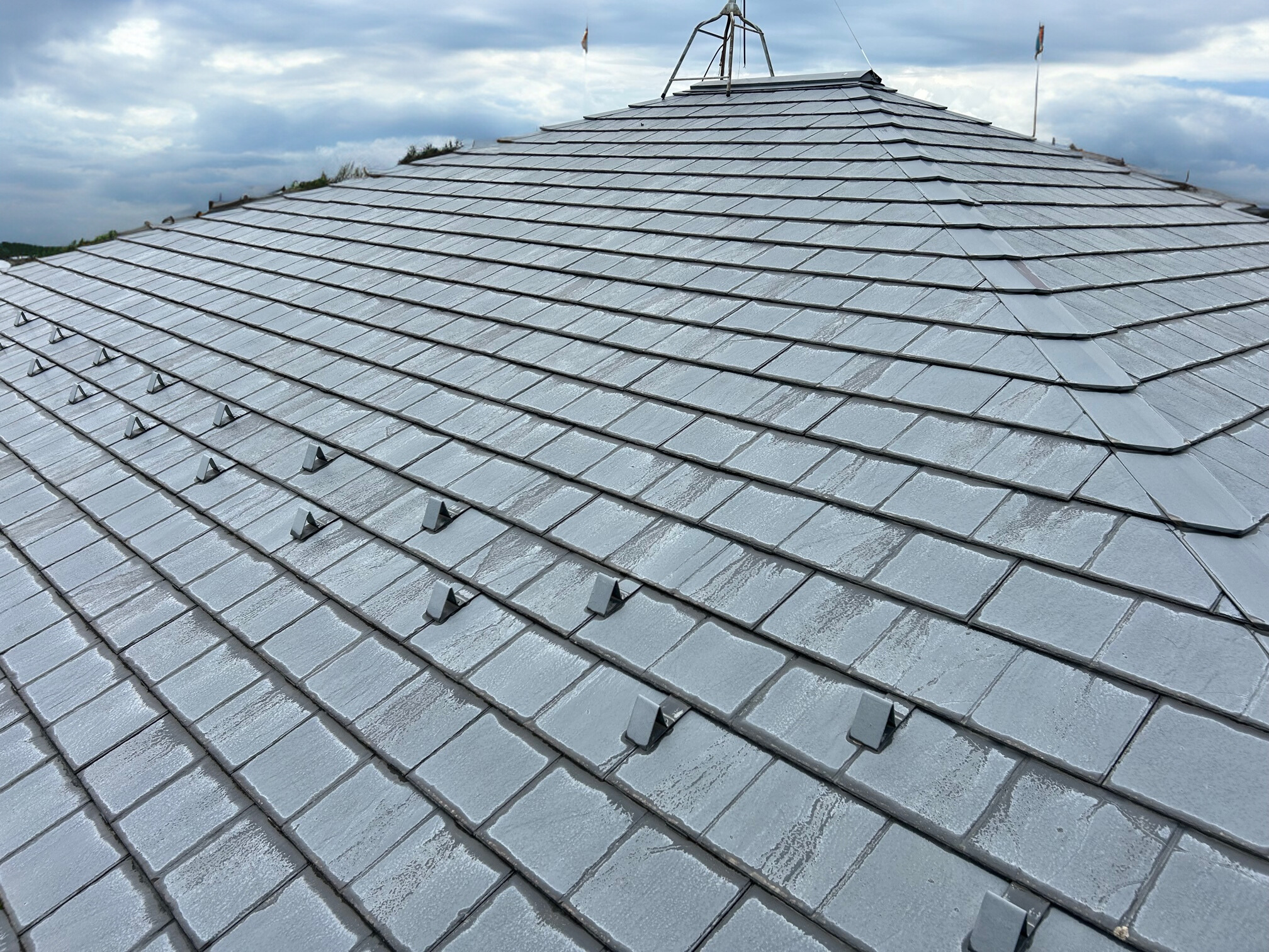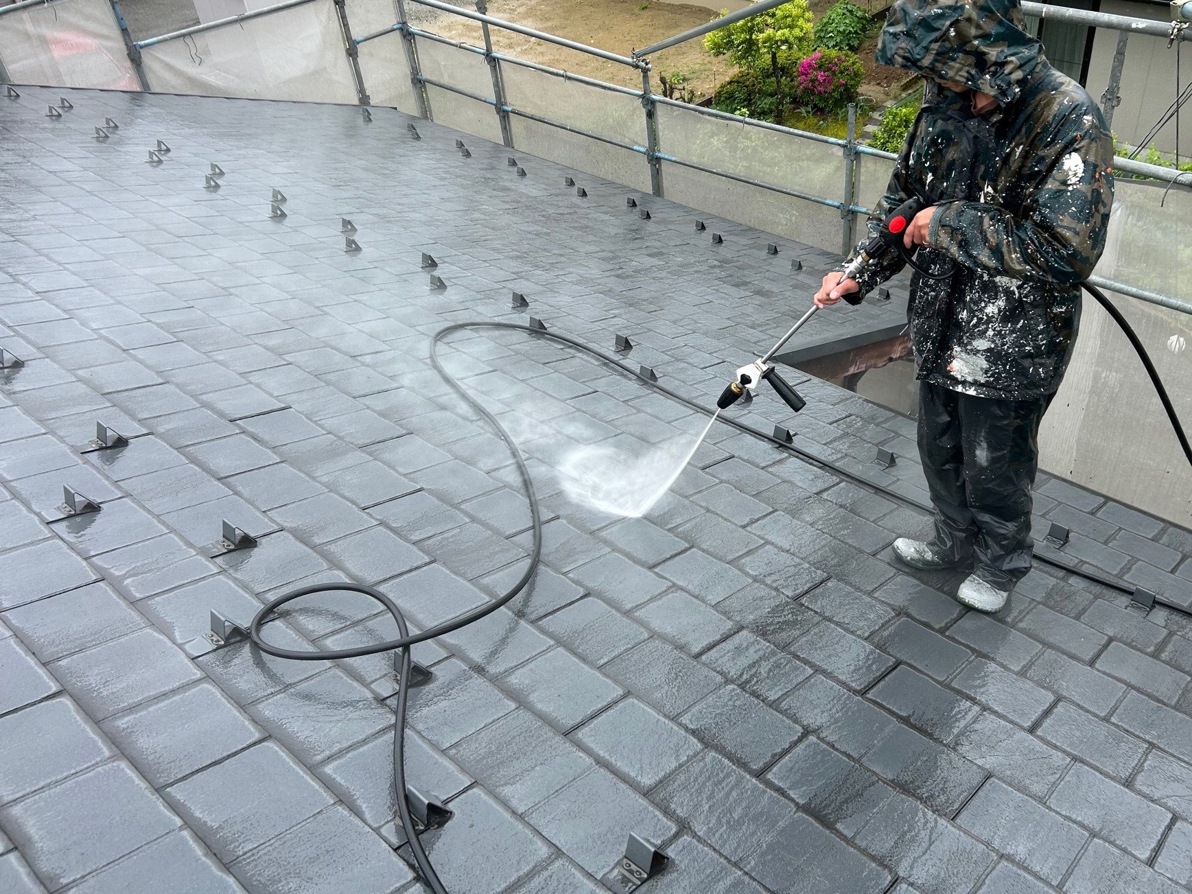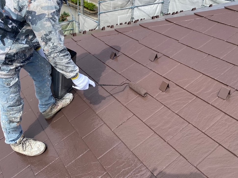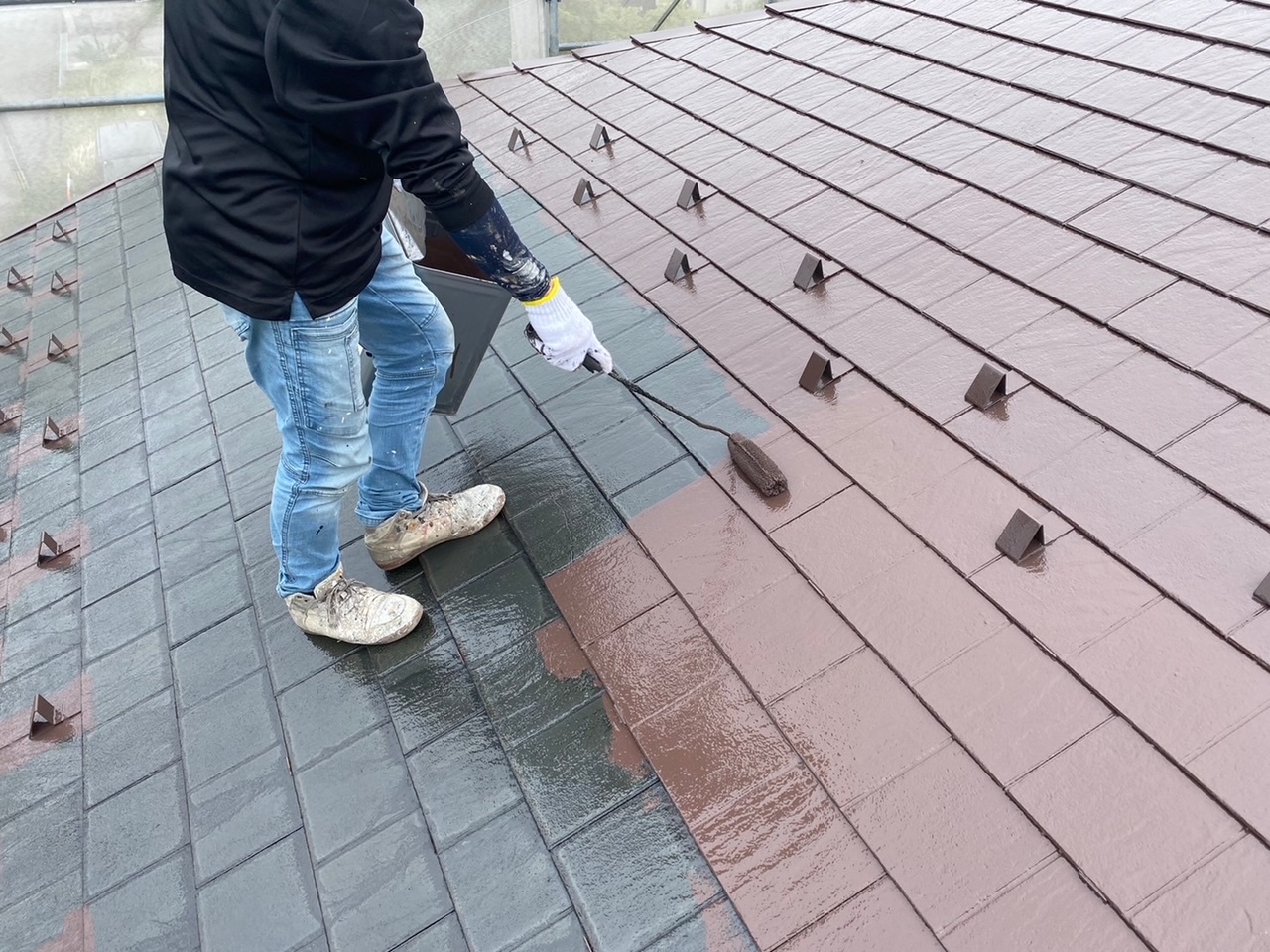 ファイン浸透造膜シーラーを使用して2回目の下塗りをします。下塗りを2回行うことで表面を均一にし、屋根材にプライマーをしっかりと浸透させます。これにより接着力が向上し、その後に塗る中塗り・上塗り塗料の密着力が上がり、塗装の持ちがよくなるのです!
