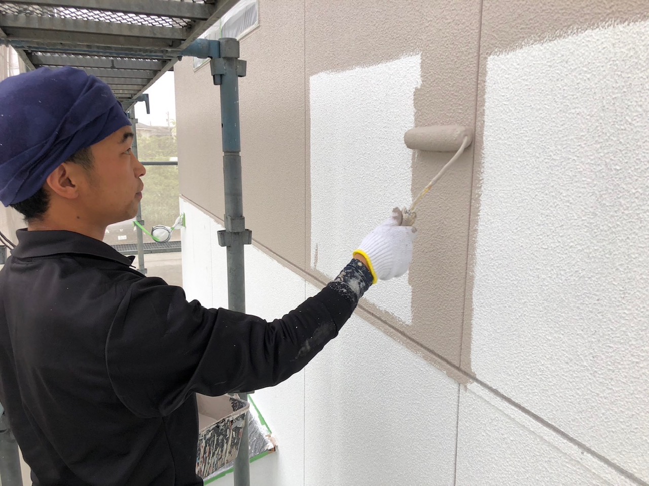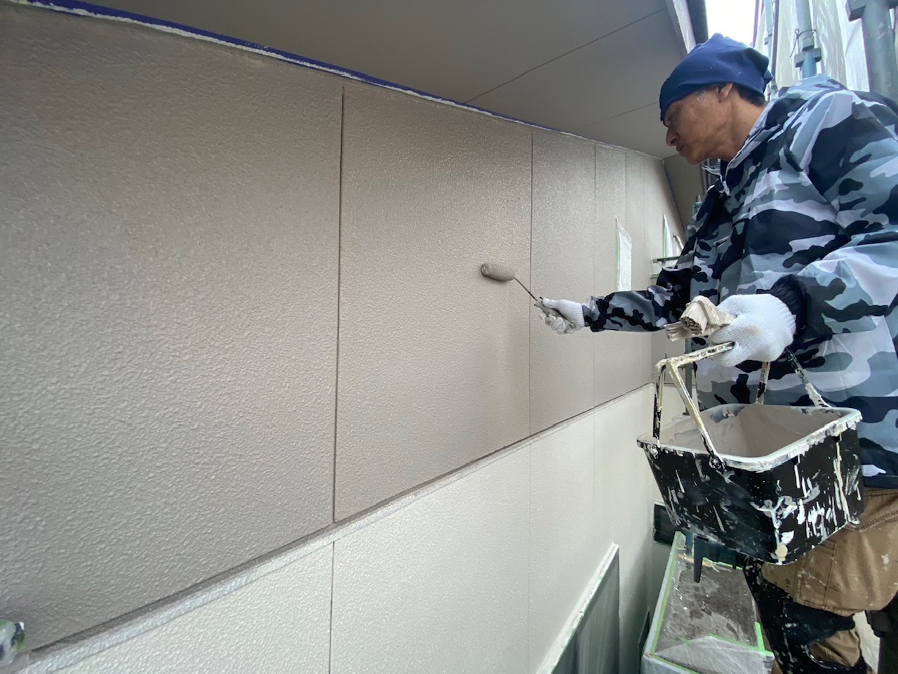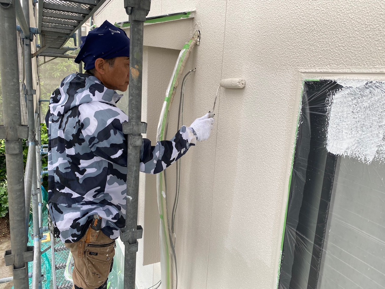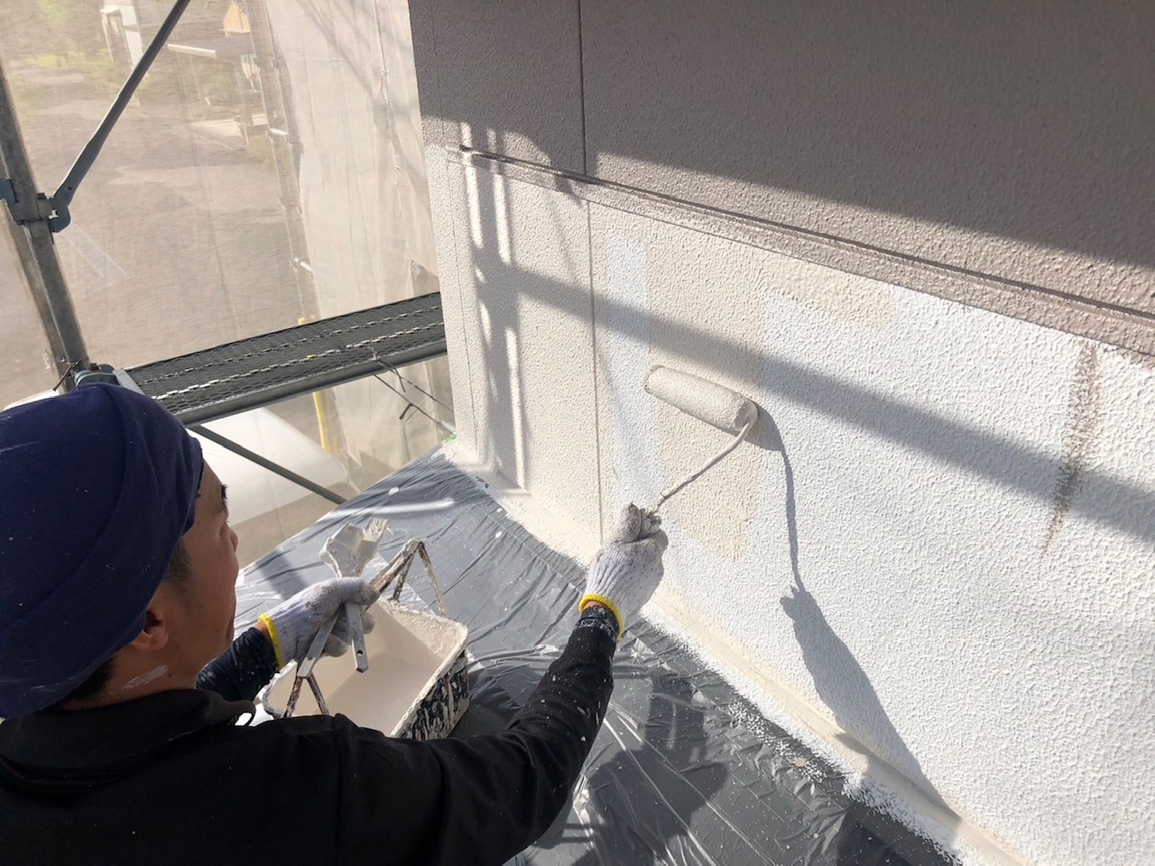 外壁のプライマー塗装をします。外壁の素材にあわせて微弾性フィラーを使用して厚塗りをました。