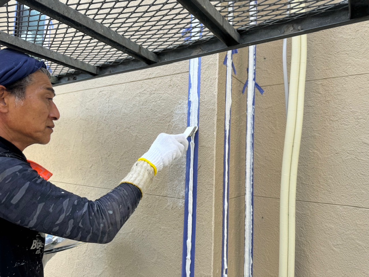 シーリング材を充填してへらで均していきます。外壁塗装専門店安井創建では「オートンイクシード」という高い耐久性・耐候性をもつシーリング材を使用しています!