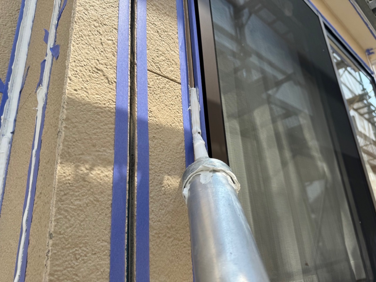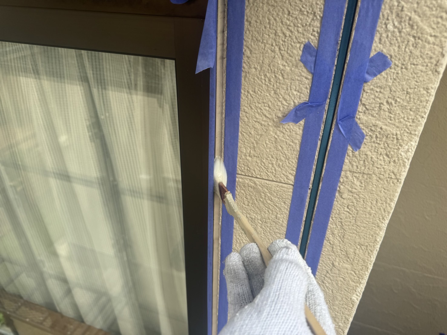 次はシール工事です。まず、プライマーを塗ります。プライマーはシールと建材を密着させ接着性を高める重要な役割を果たします。