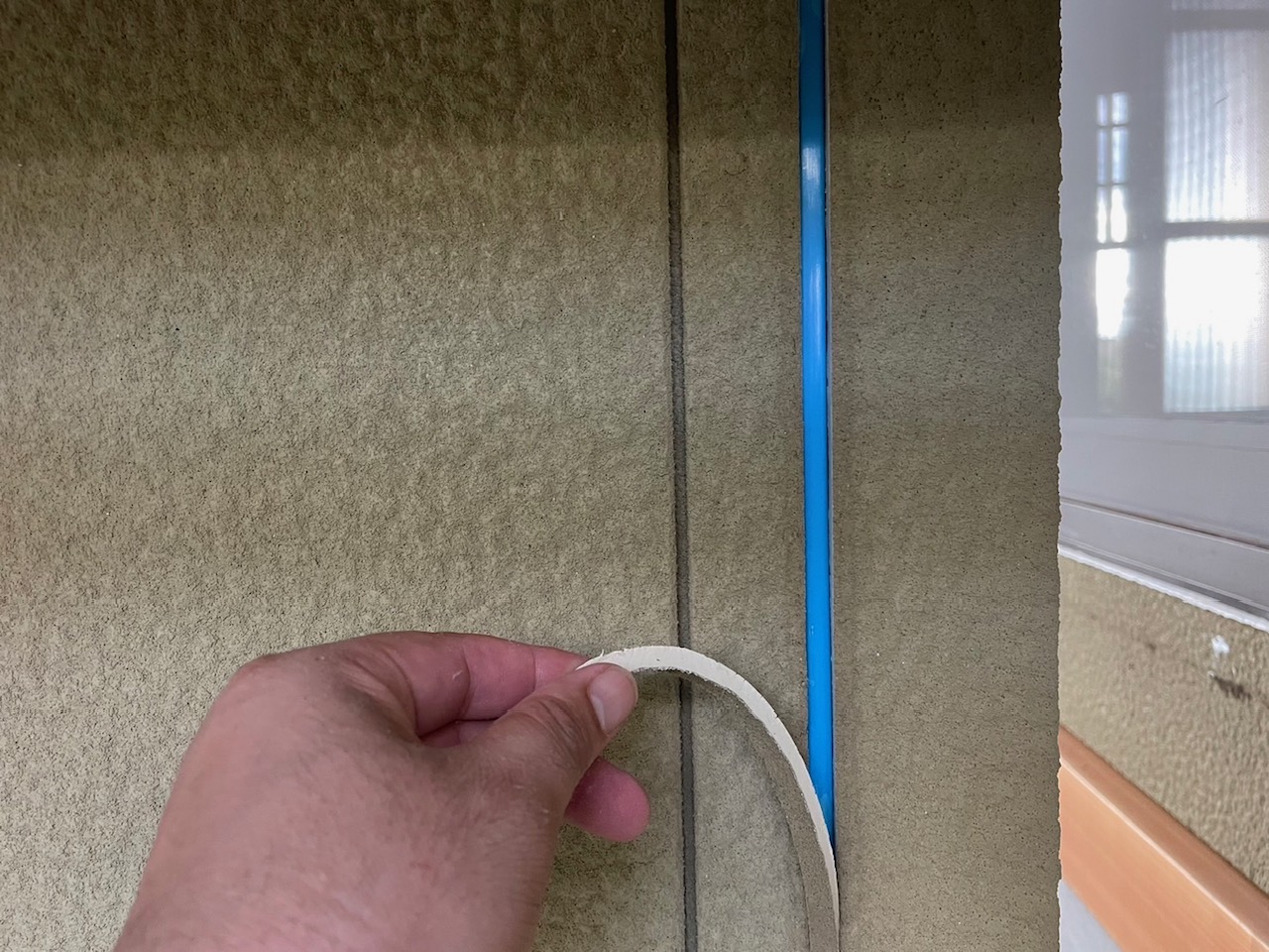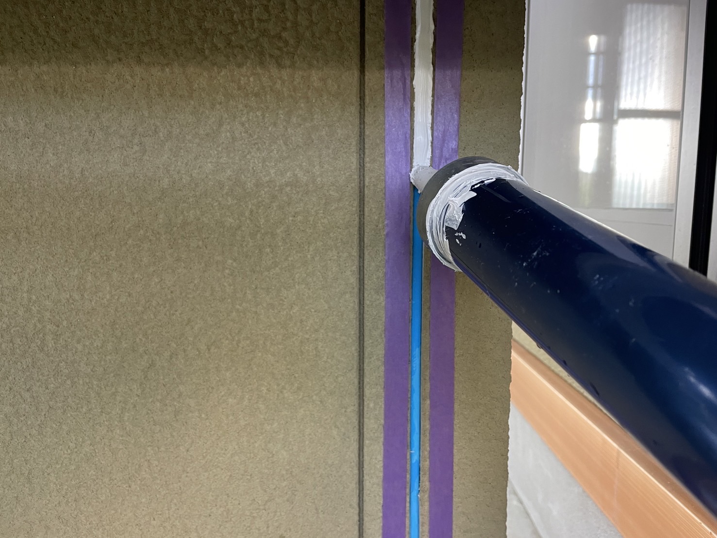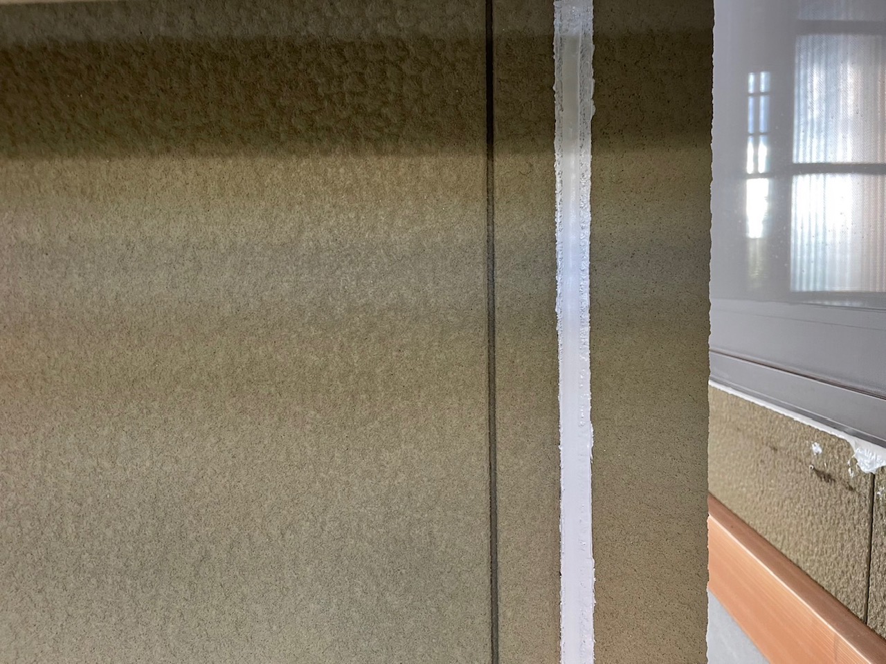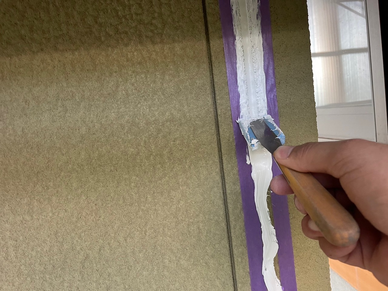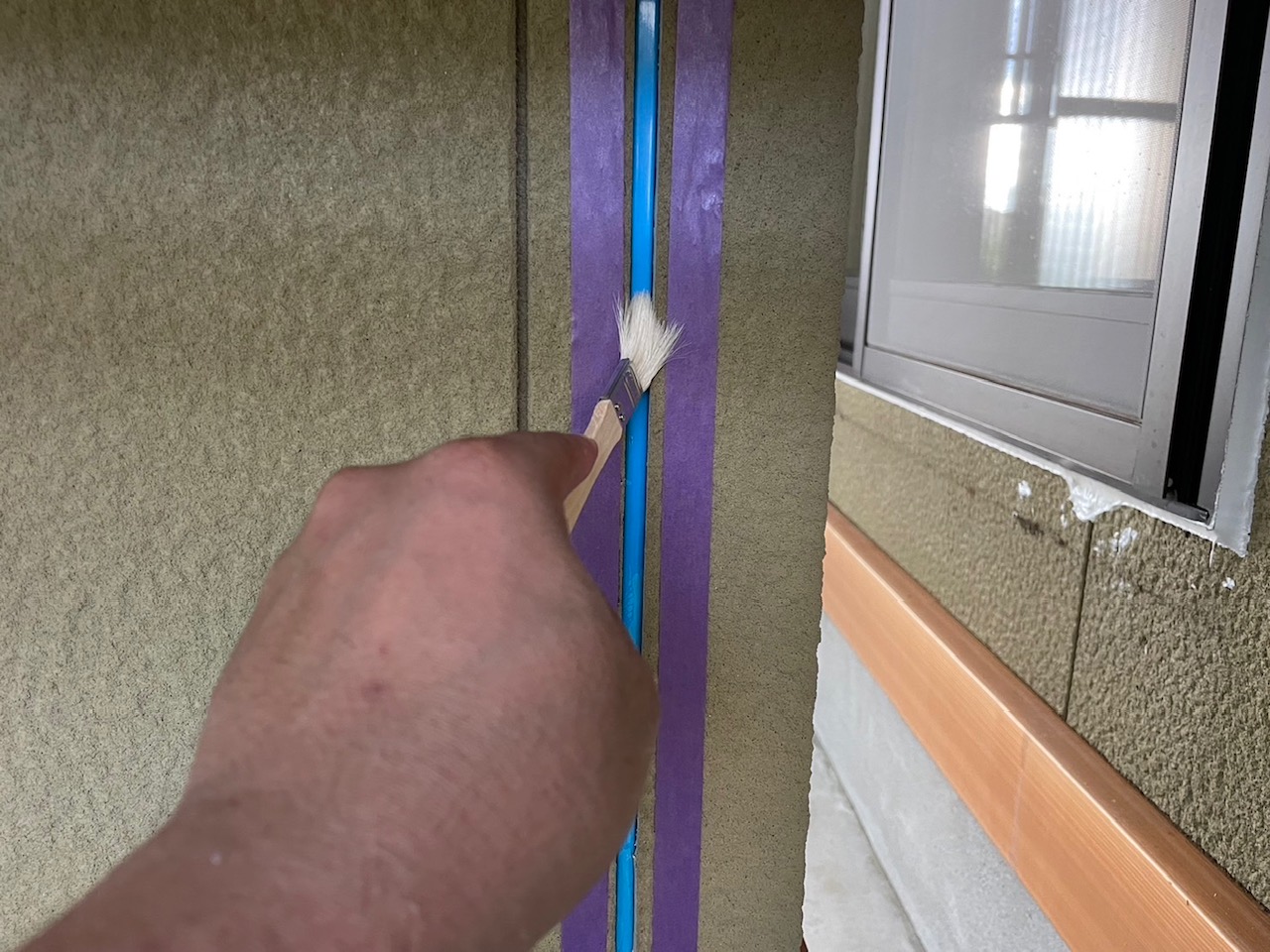 シーリング材を充填してへらで均していきます。外壁塗装専門店安井創建ではオートンイクシードという高い耐久性・耐候性をもつシーリング材を使用しています!