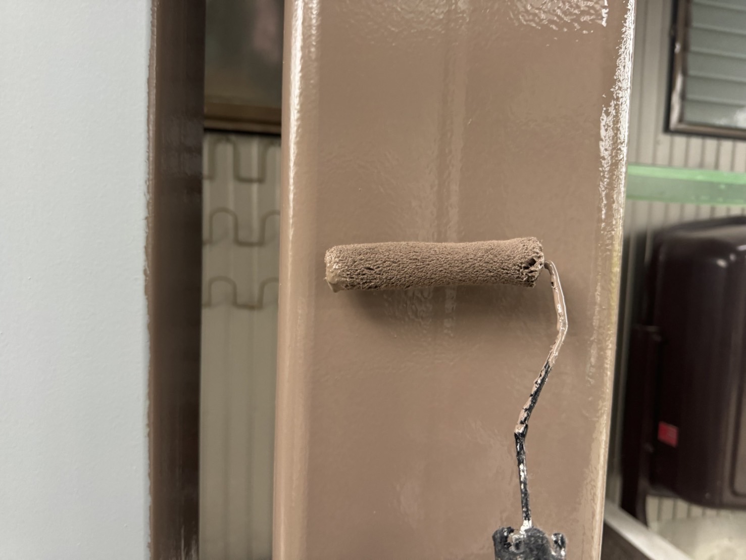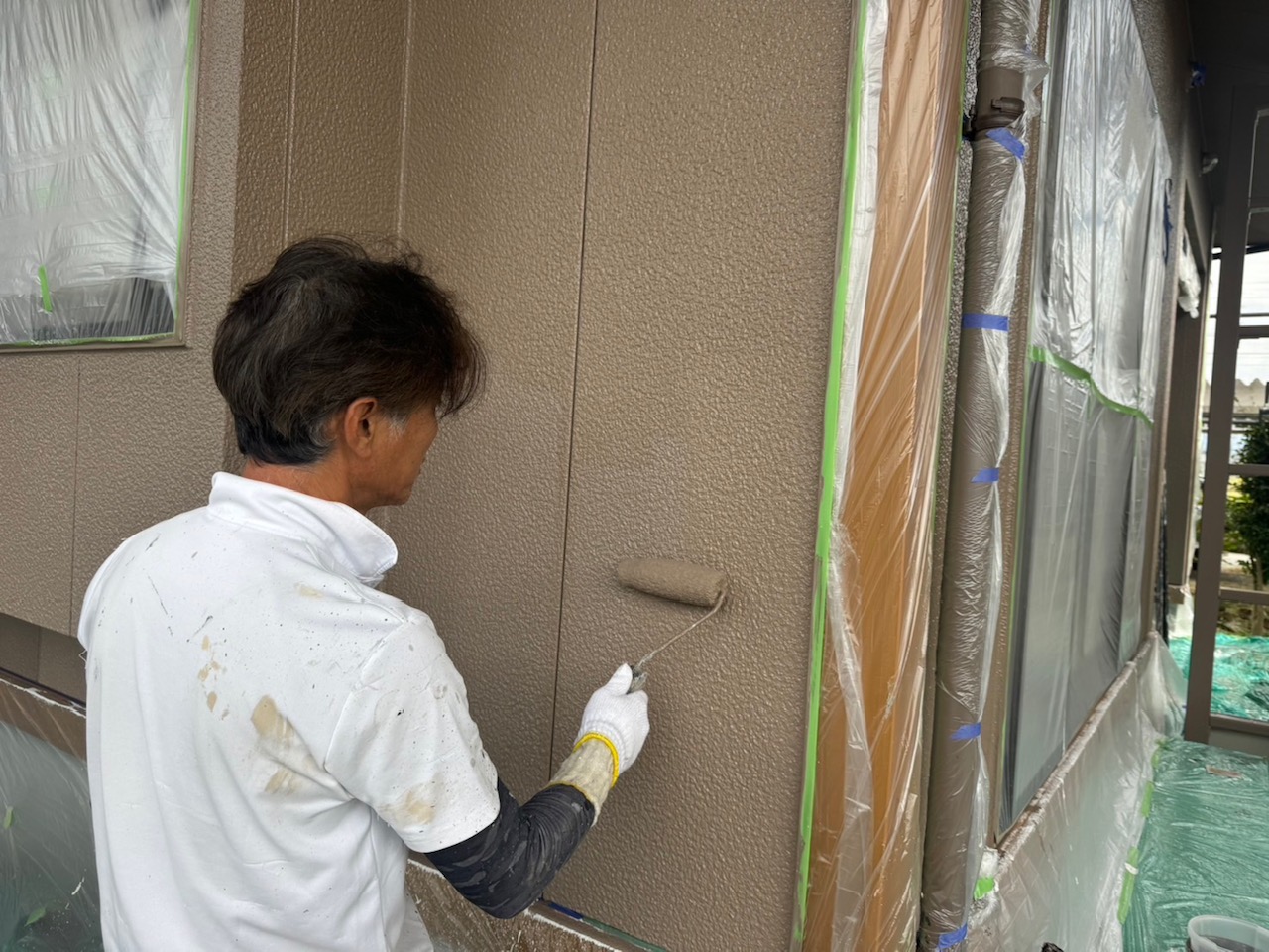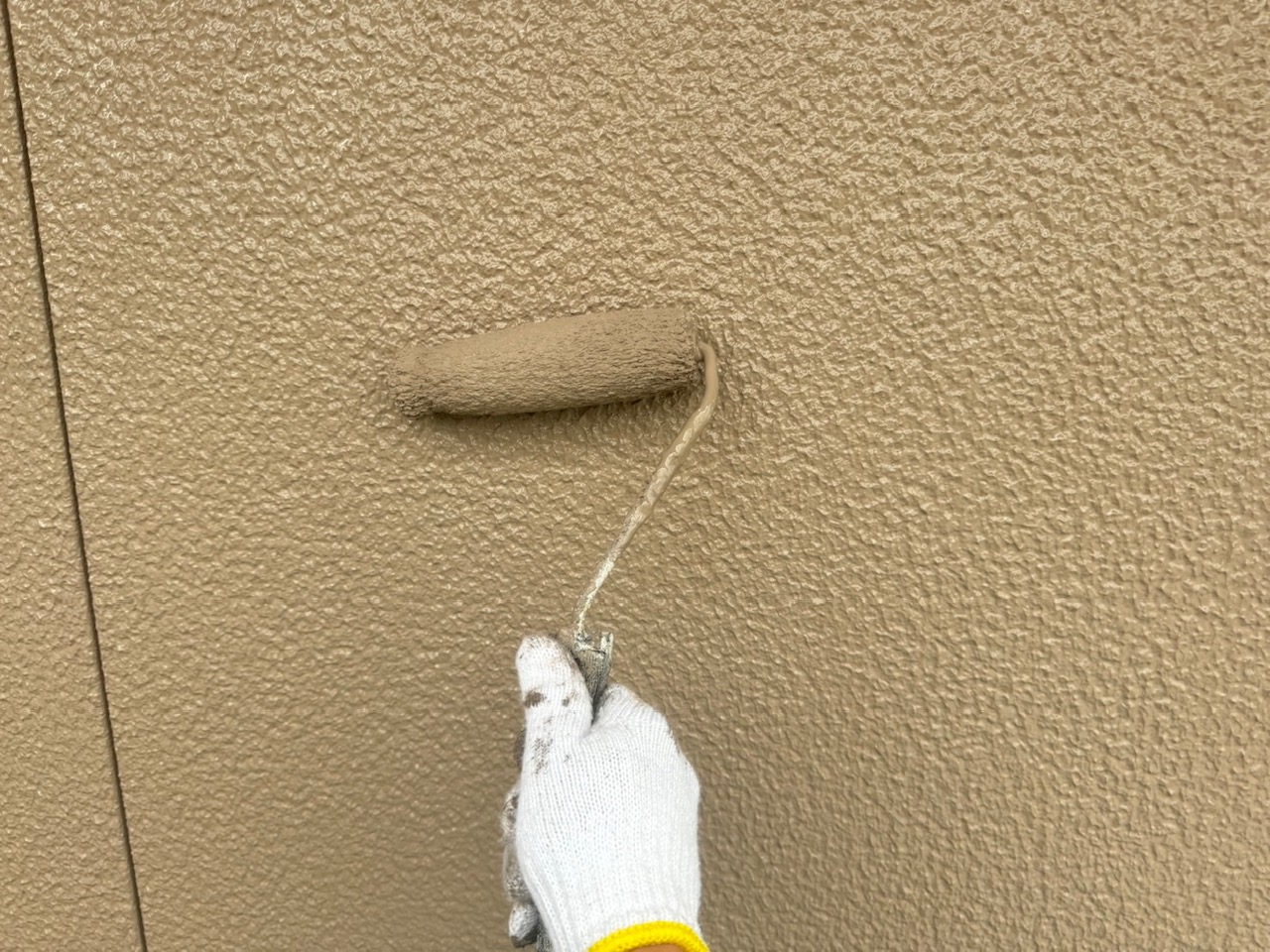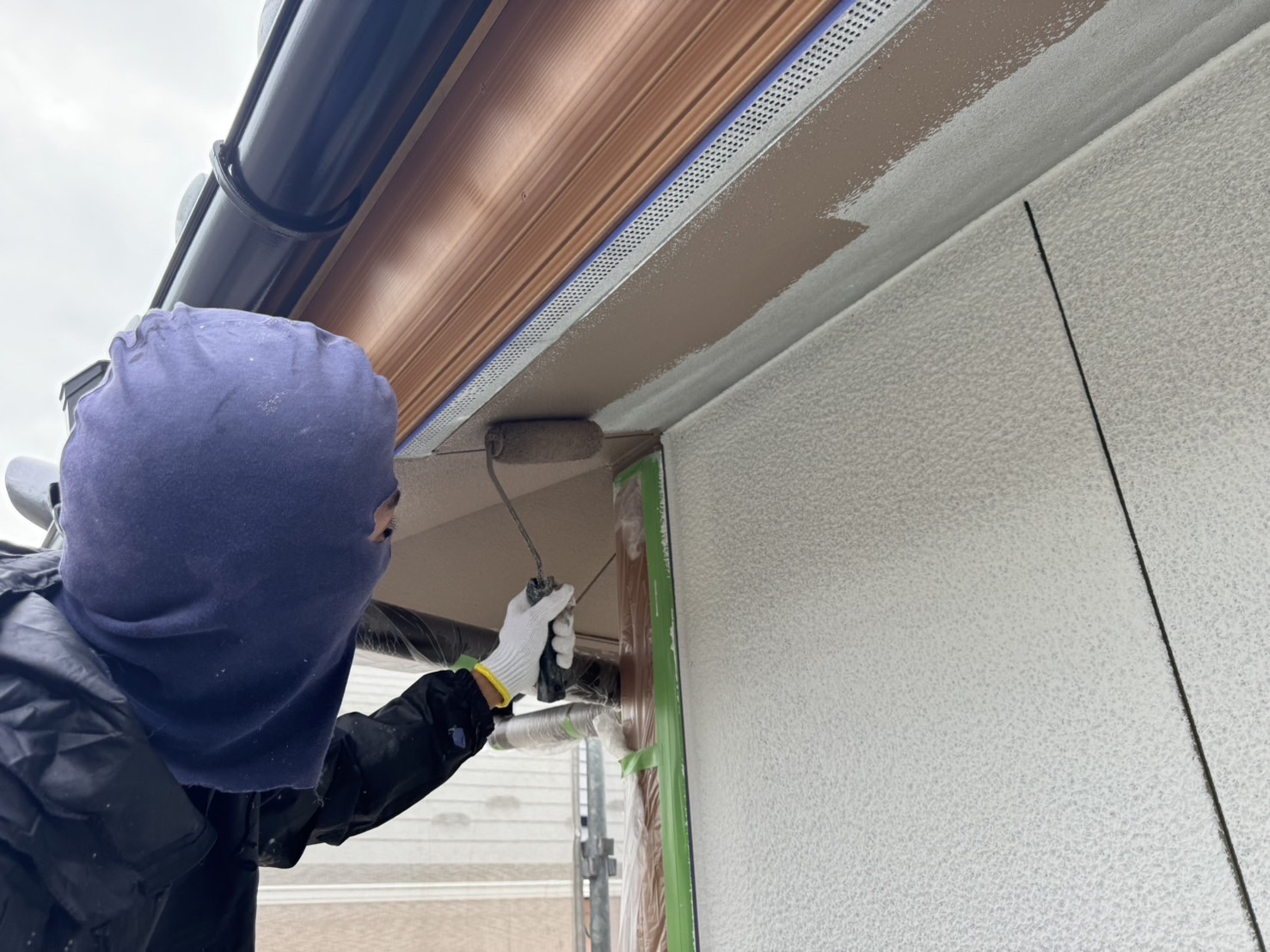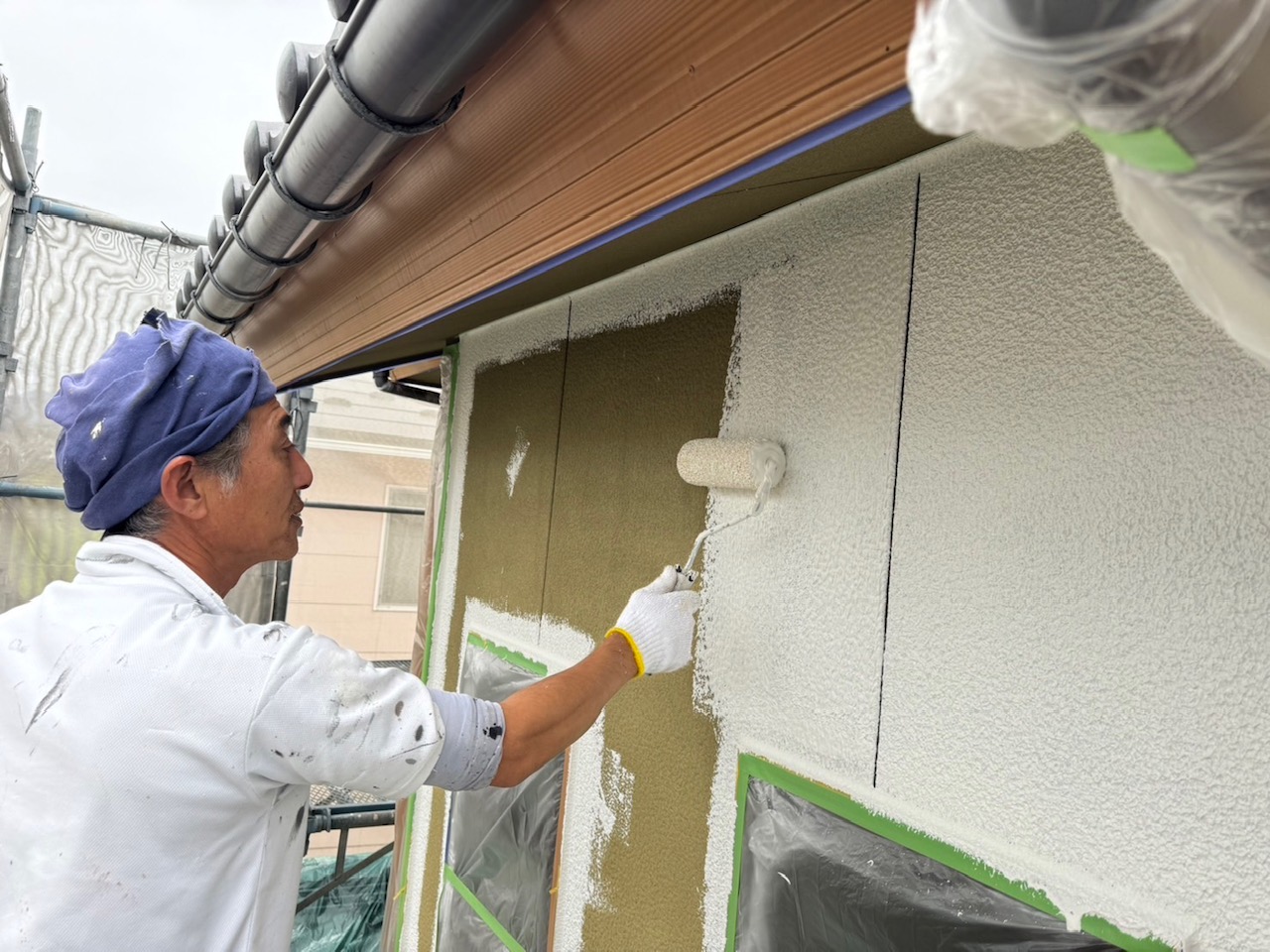 つづいては、外壁の下塗り塗装をします。外壁材にあわせて微弾性フィラーを使用して厚塗りしました。