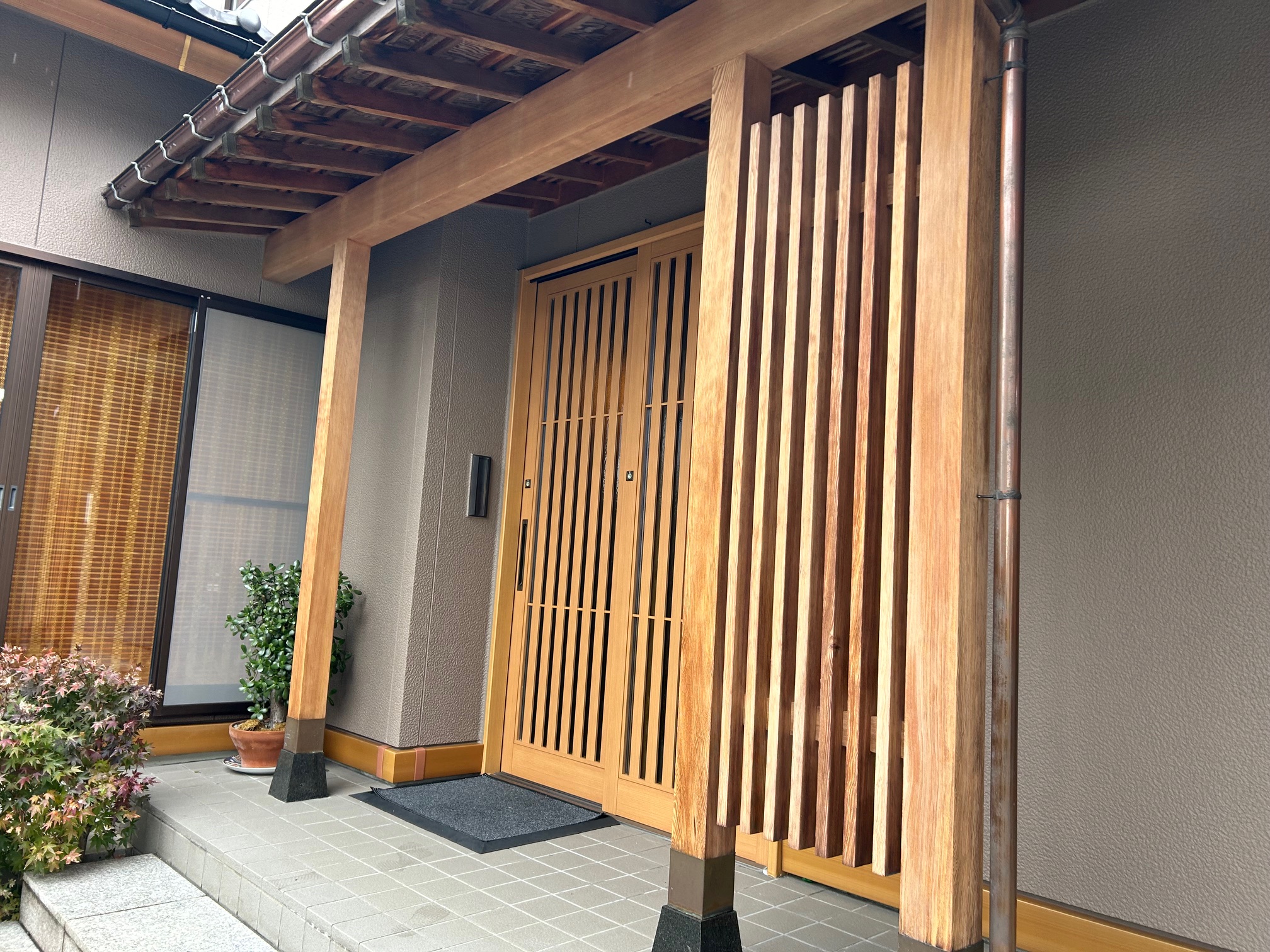 玄関前の木柱は、漂白を行いました。木材独特の染み込んだ汚れを取り除き、お家の顔である玄関が明るくなりました!