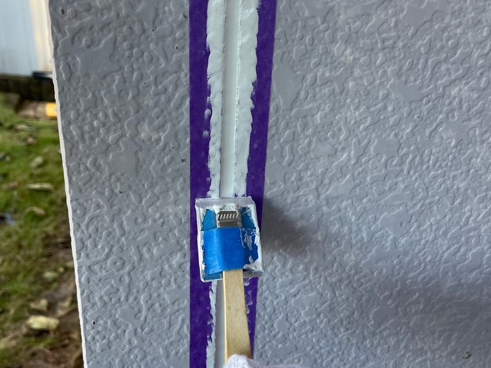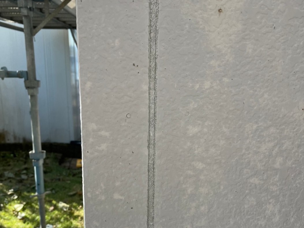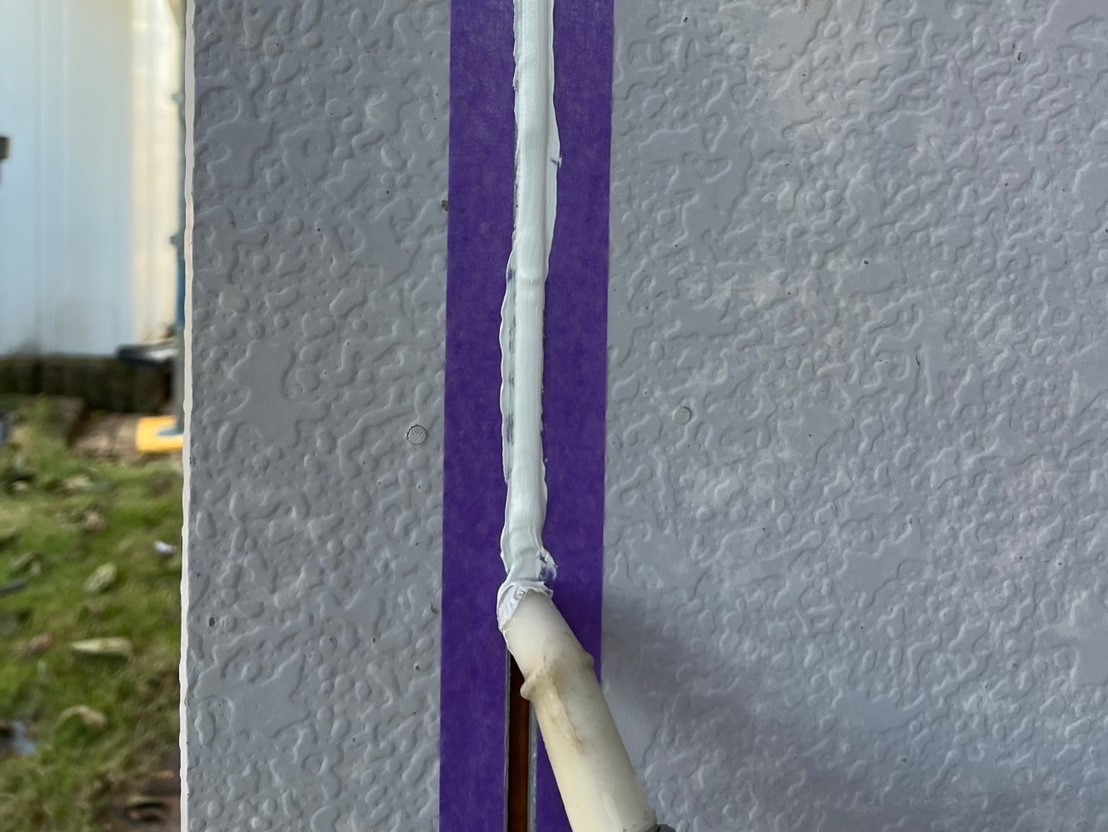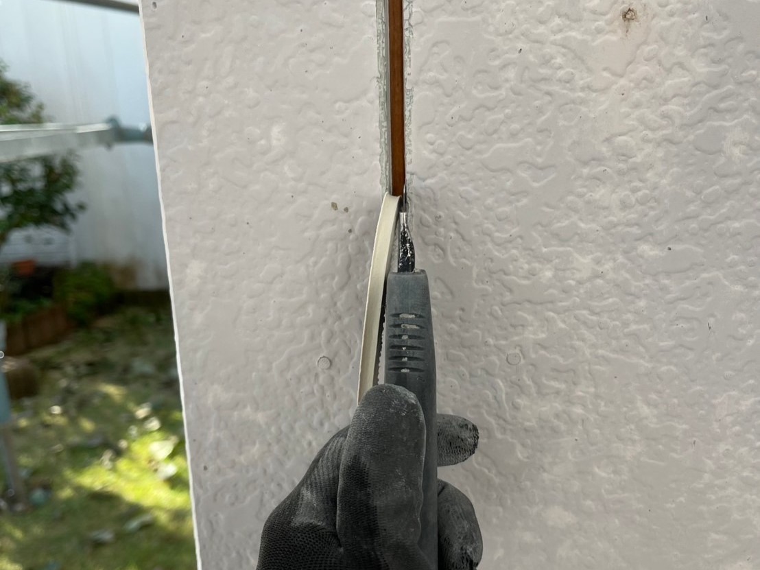 シーリング材を充填してへらで均していきます。外壁塗装専門店安井創建ではオートンイクシードという高い耐久性・耐候性をもつシーリング材を使用しています!