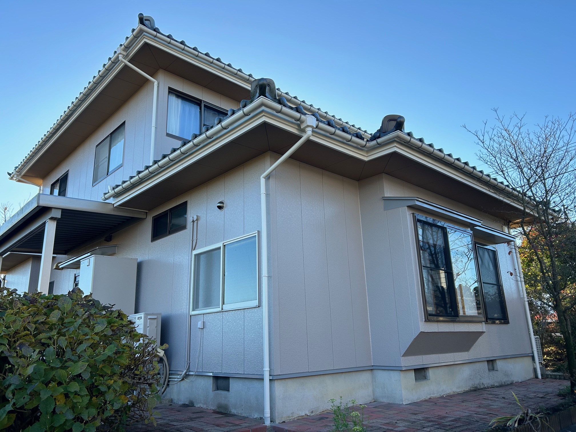 均一に塗膜ができ、艶のある綺麗な仕上がりになっています!雨樋は、塗装ではなく新しい雨樋へ交換しました。