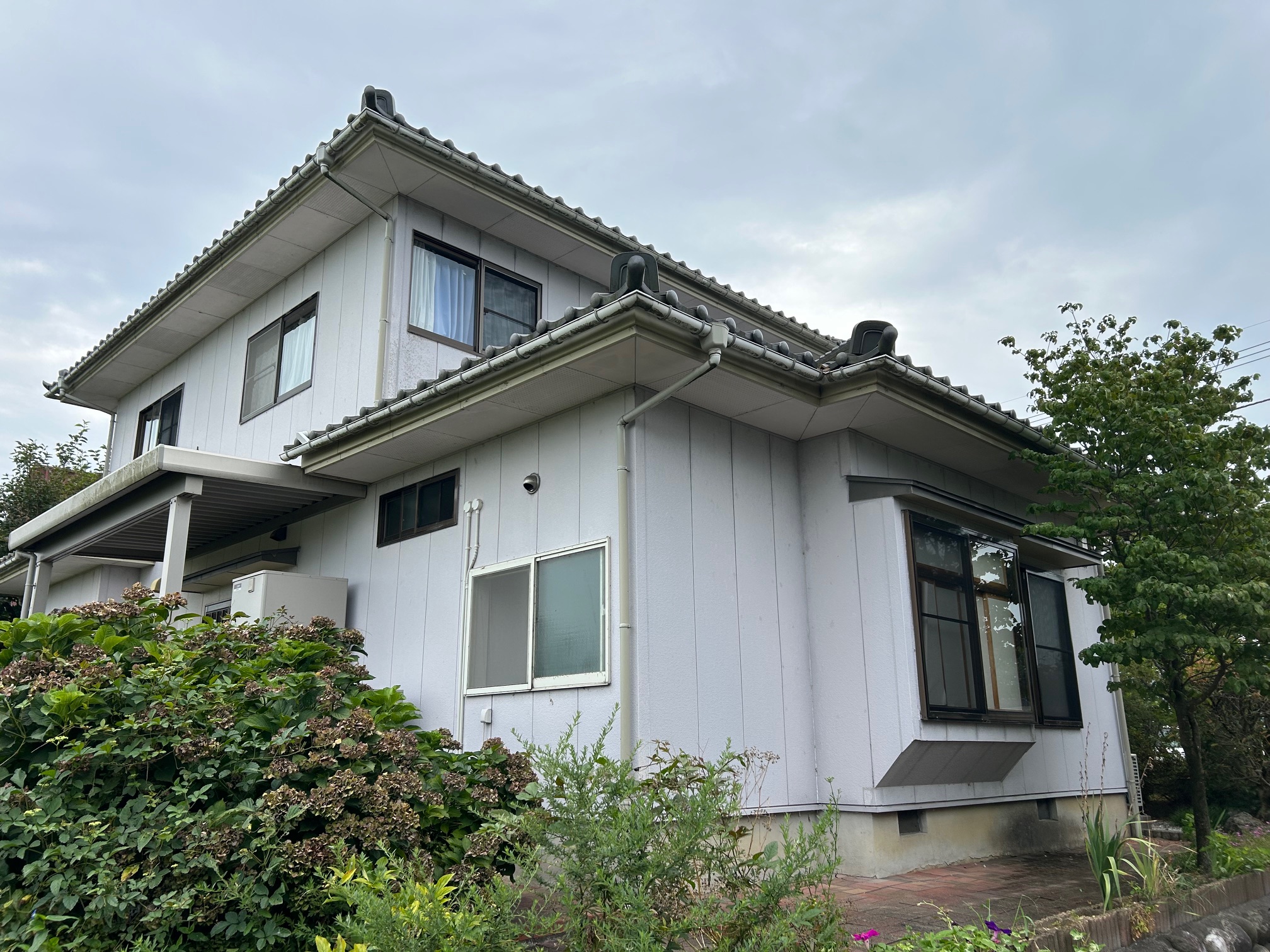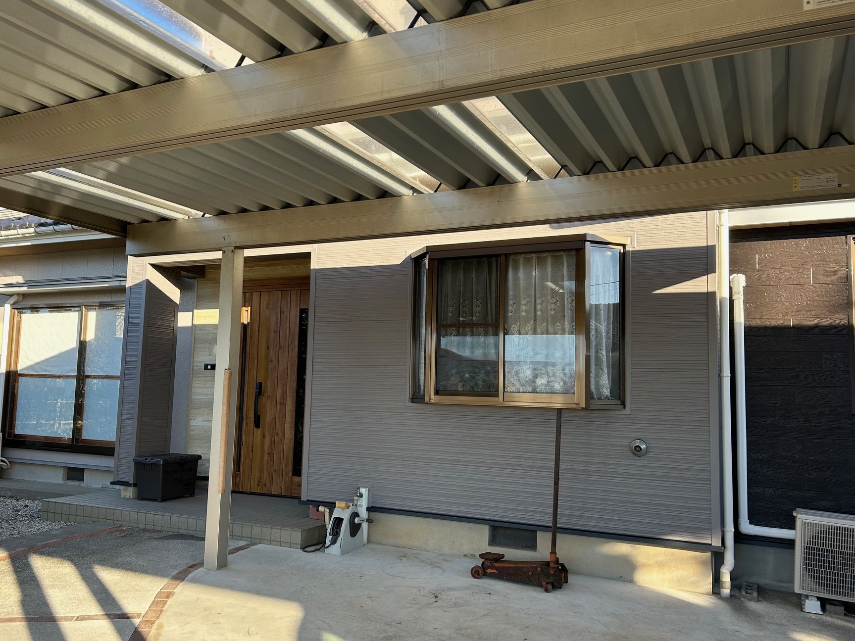 板金・サイディング補修は、弊社が信頼を置く業者さんへ依頼しました。たくさんの種類があるサイディングですが、カタログなどを参考に組み合わせを選ばれ、3種類のサイディングを使用しています。外壁塗装のカラーとサイディングの組み合わせによって、お客様のセンスがひかる外観になりました!
