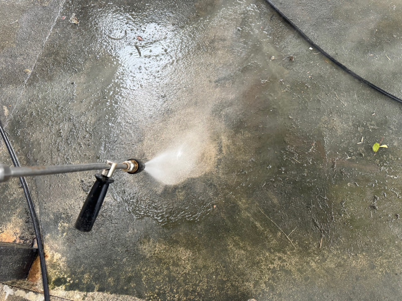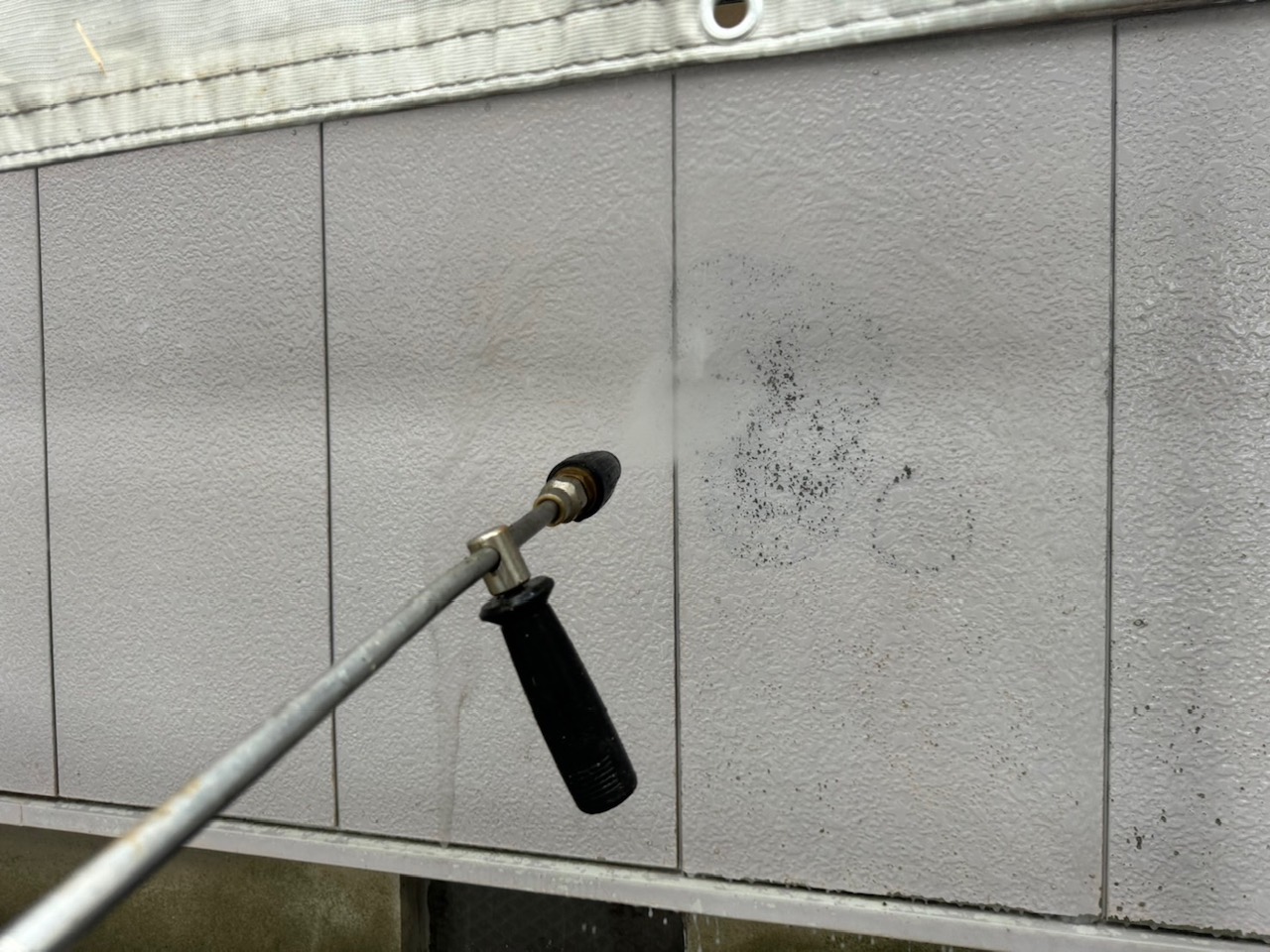 はじめに、高圧洗浄を行い汚れを落とします。塗装の仕上がりを左右する大事な作業です。玄関前の地面もサービスで洗浄いたしました!