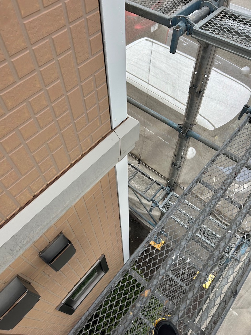 現状を踏まえて、凍害箇所は板金工事にて補修を行い、外壁全体は長期間美観を保つことのできる無機塗料のグランセラトップ2液水性を使用して塗装をすることとなりました。また、同時に屋上防水工事も行うこととなりました。