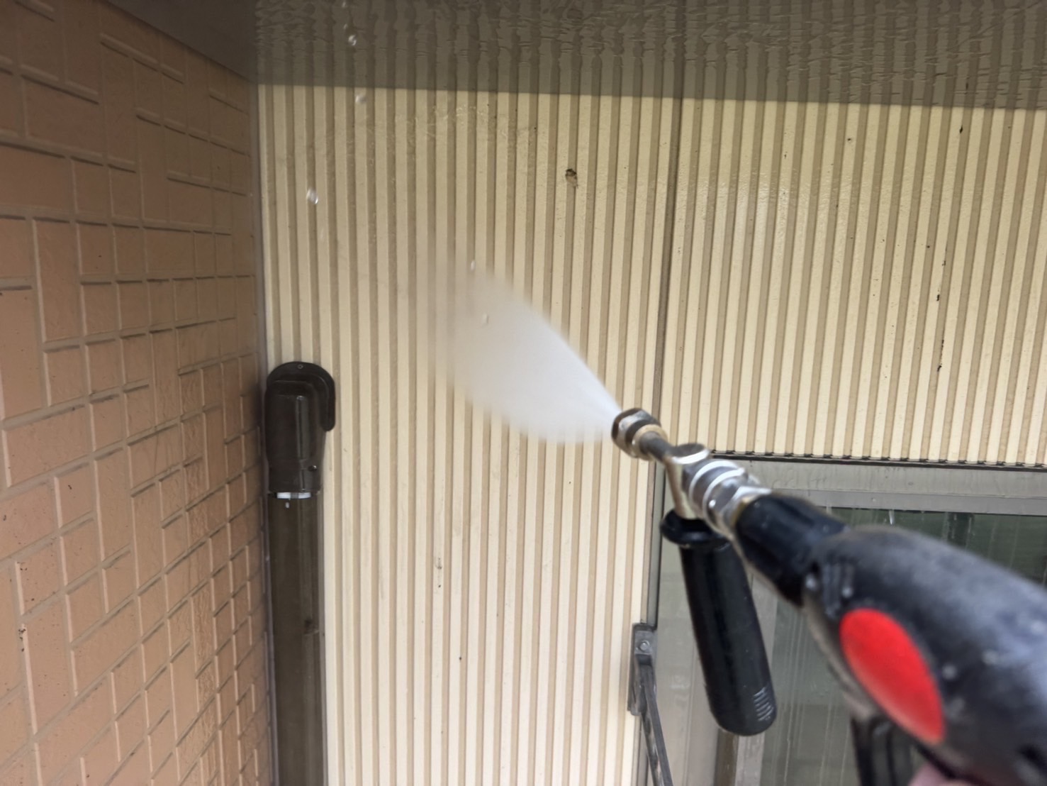 はじめに、高圧洗浄を行い汚れを落とします。塗装の仕上がりを左右する大事な作業です。