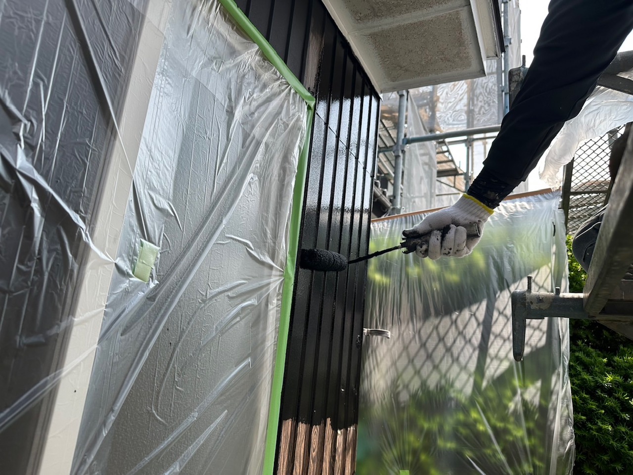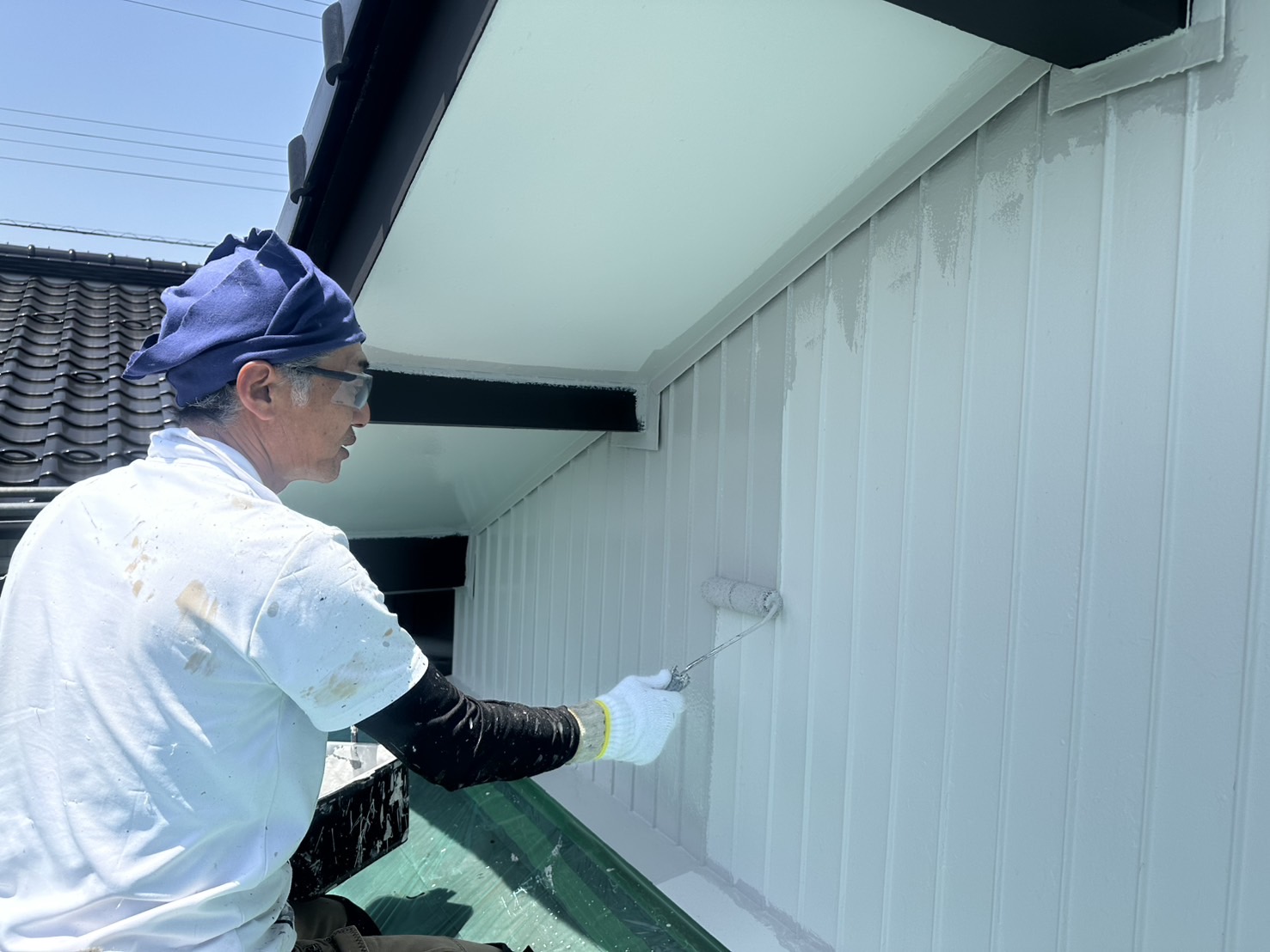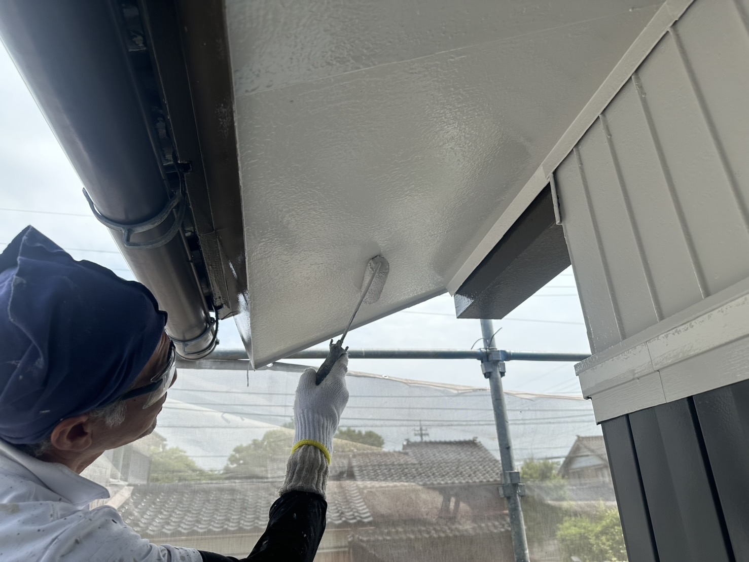 軒裏などの付帯部分も同様に1液ファインフッソUVを2回塗りして仕上げていきます。