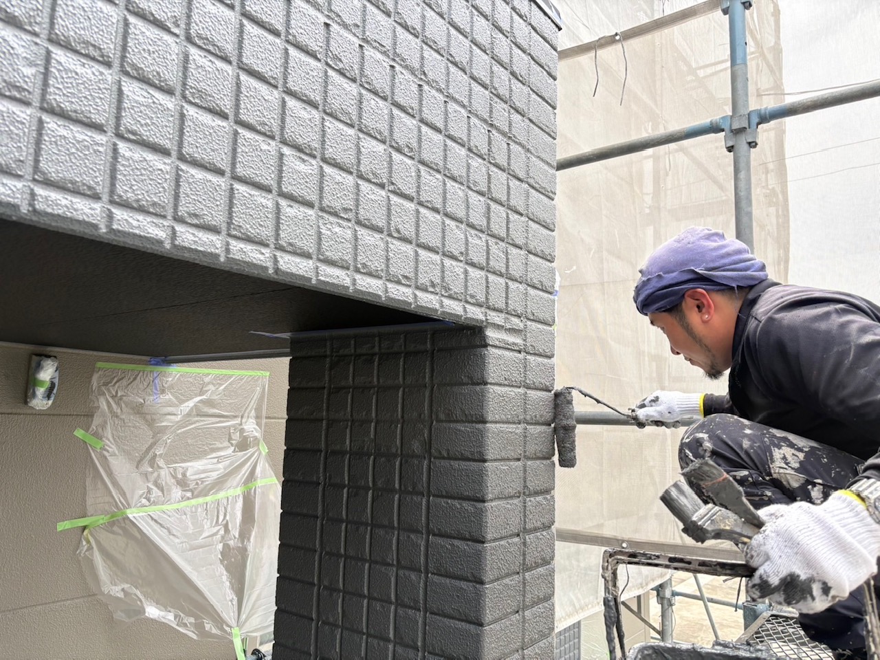 現状を踏まえて、剥がれのある部分はモルタルにて補修を行い、外壁全体は長期間美観を保つことのできる無機塗料のグランセラトップ2液水性を使用して塗装をすることとなりました。また、同時に屋根の塗装工事も行うこととなりました。