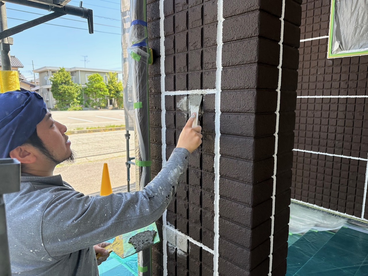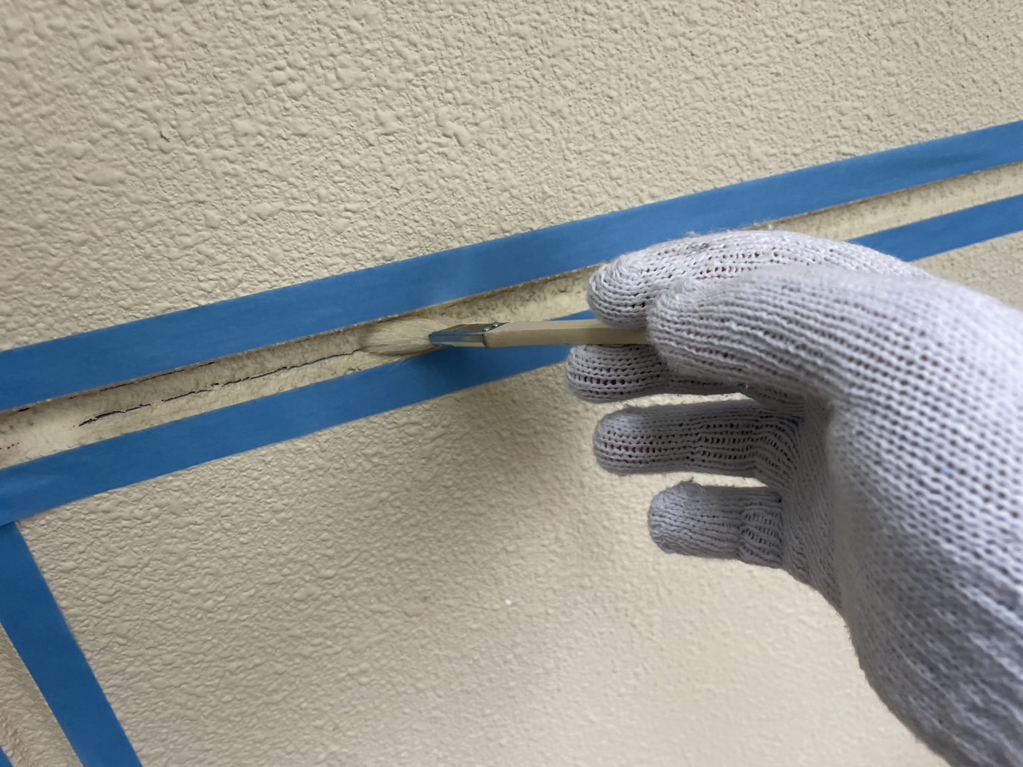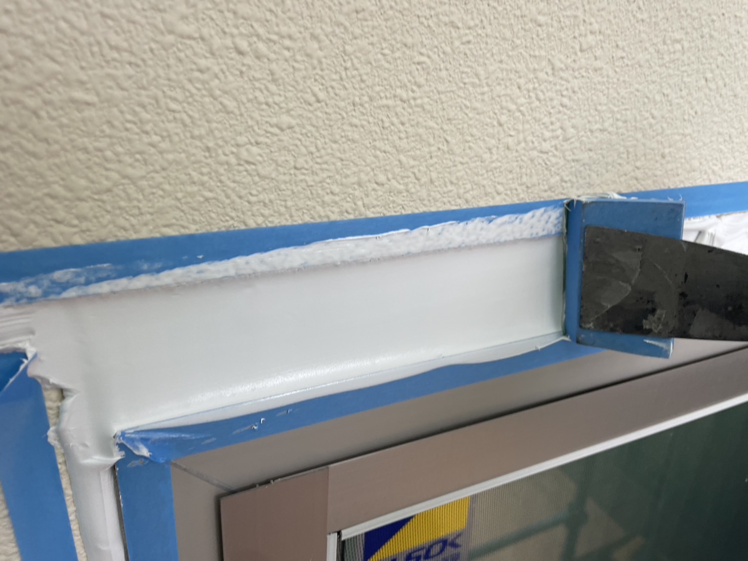 シーリング材を充填してへらで均していきます。外壁塗装専門店安井創建ではオートンイクシードという高い耐久性・耐候性をもつシーリング材を使用しています!