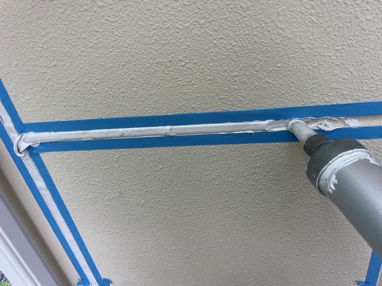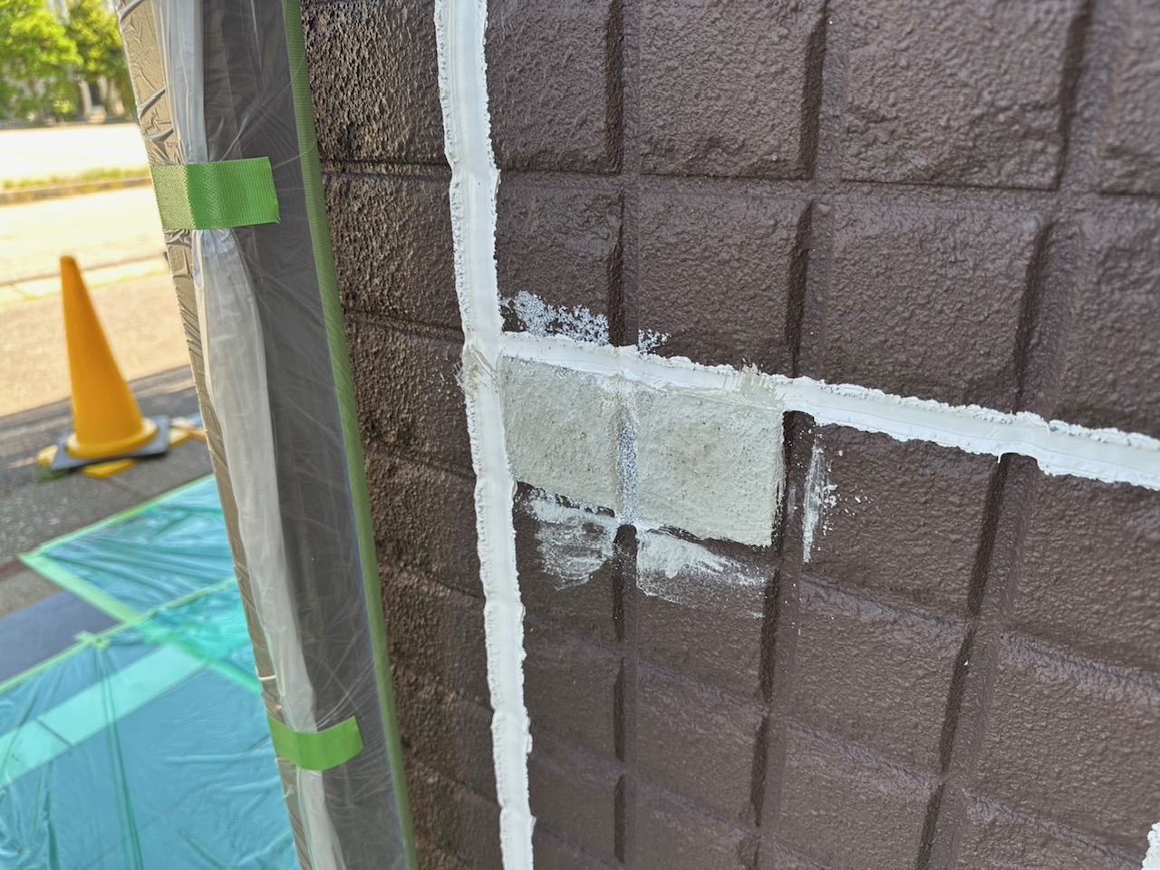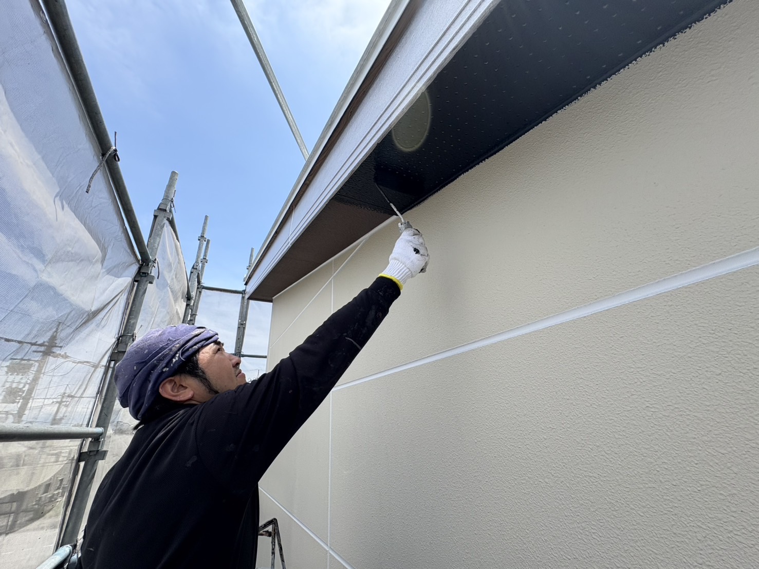 シーリング材を充填してへらで均していきます。外壁塗装専門店安井創建ではオートンイクシードという高い耐久性・耐候性をもつシーリング材を使用しています!