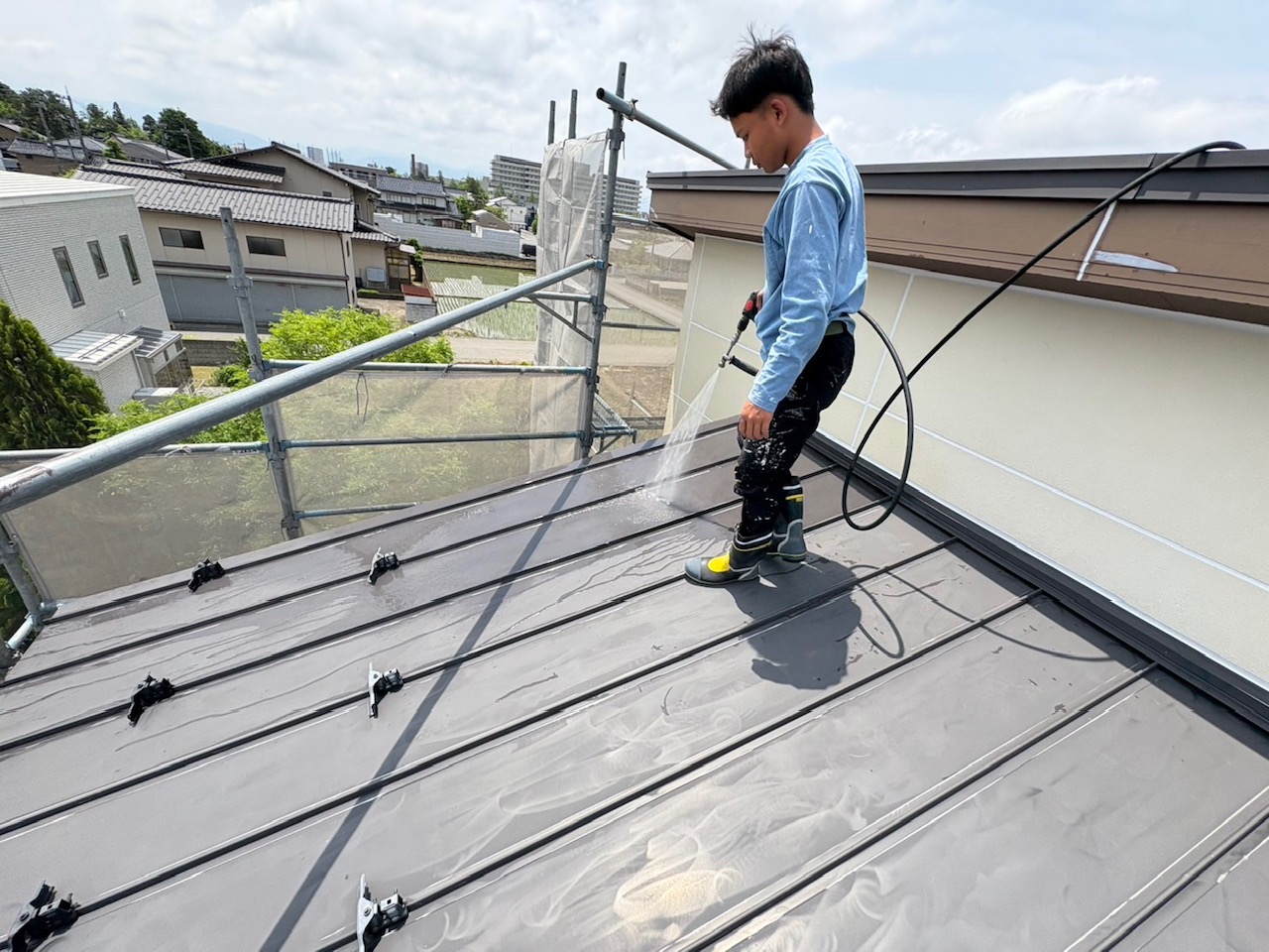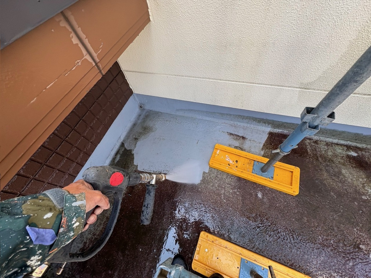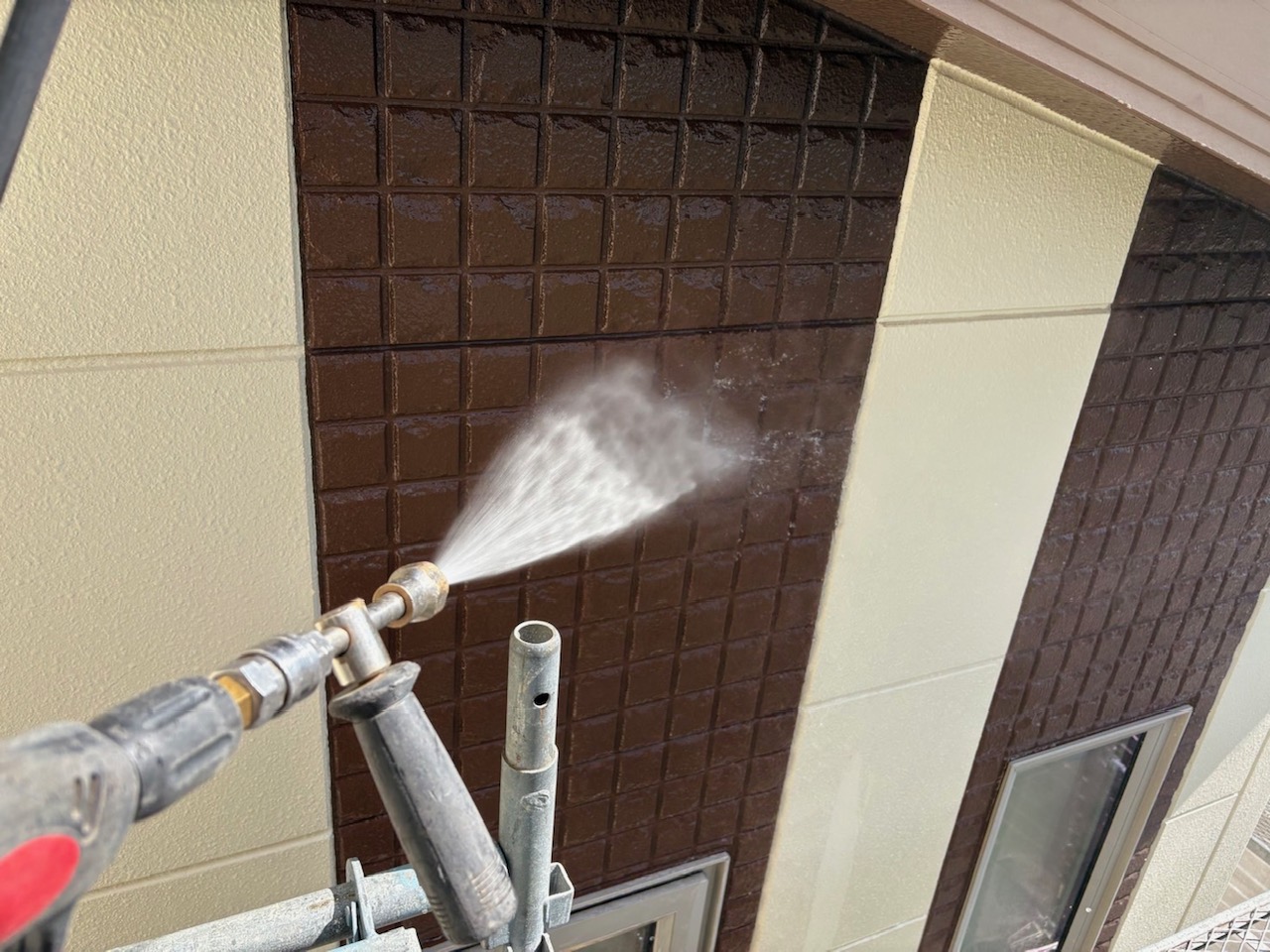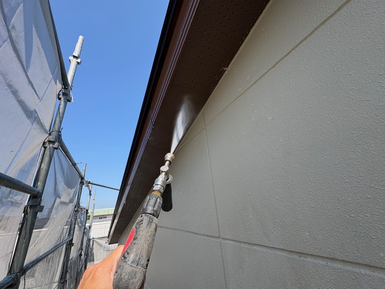 はじめに、蓄積した汚れを高圧洗浄でしっかりと落としていきます。洗浄作業は塗装の仕上がりにも大きく影響する大切な工程です!