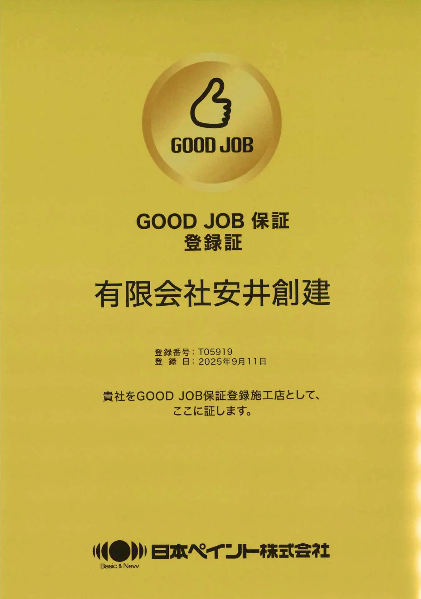 「GOOD JOB 保証」とは、塗料メーカーである日本ペイントが、高い施工技術と信頼性を持つ塗装店を厳選して認定する制度です。メーカーが規定する適正な塗料選定と工法を遵守していることが認められたことを意味します。万が一、施工後に不具合が生じた際も、施工店とメーカーが連携して対応するため、外壁塗装最大7年、屋根塗装最大3年という大きな安心を提供できるのが最大の特徴です。